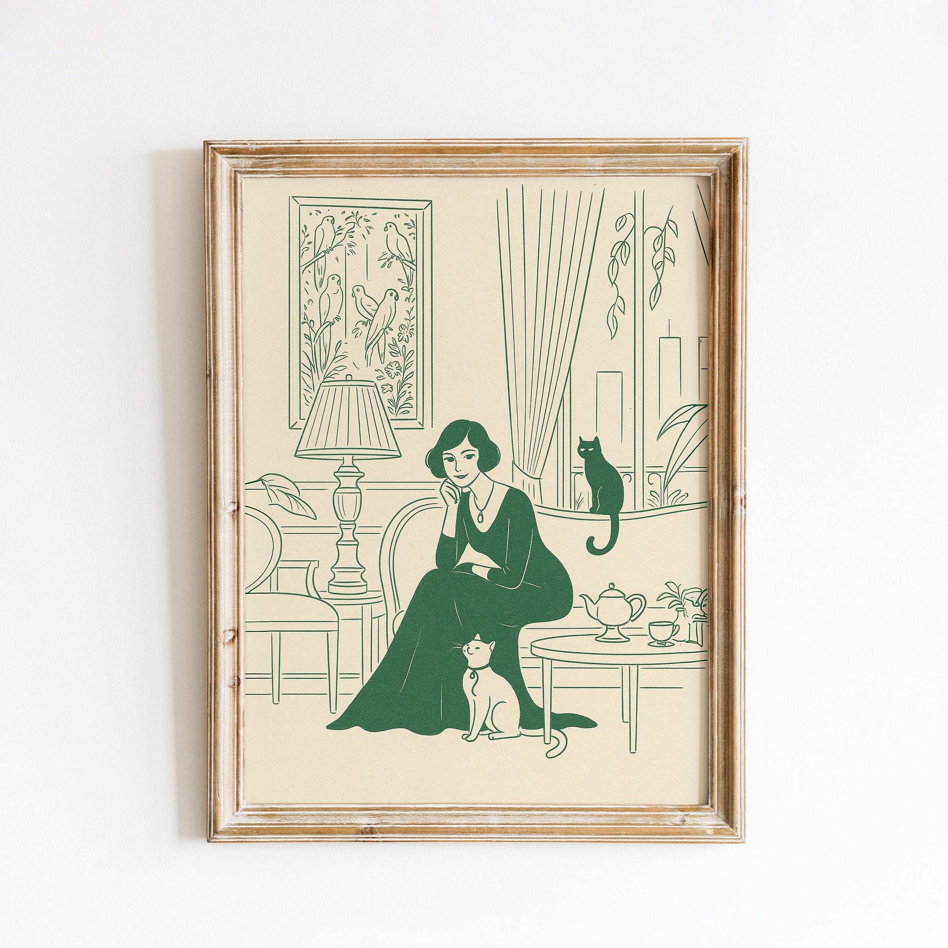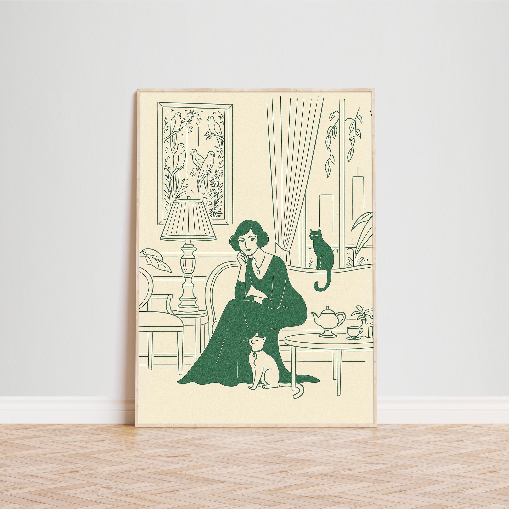 Afternoon Tea – Elegant Woman with Cats Line Art Poster, Vintage Minimal Illustration