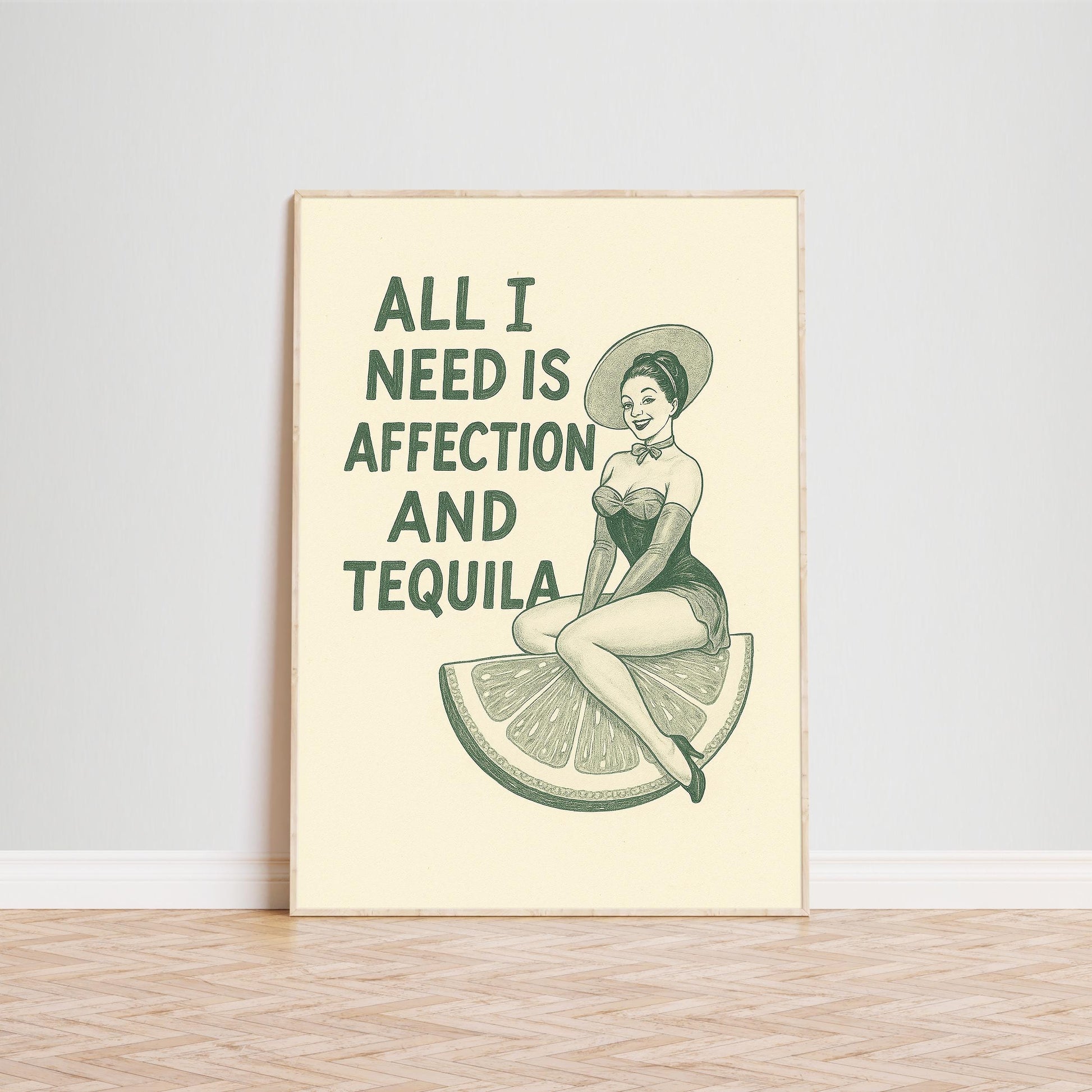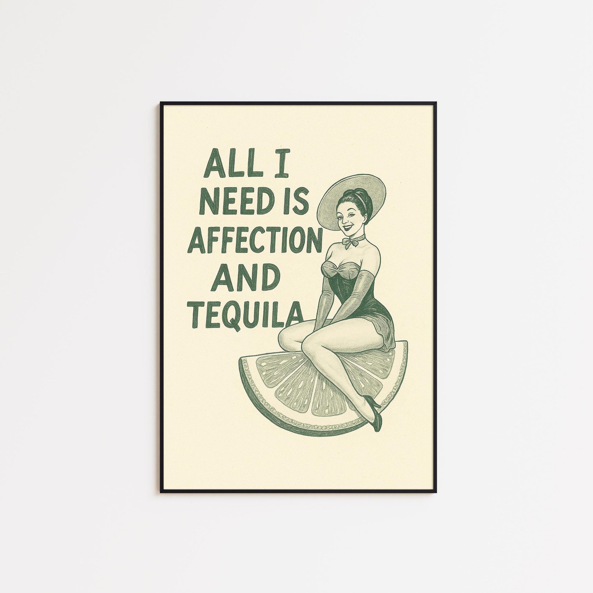 All I Need Is Affection and Tequila Poster – Retro Pin-Up Cocktail Art