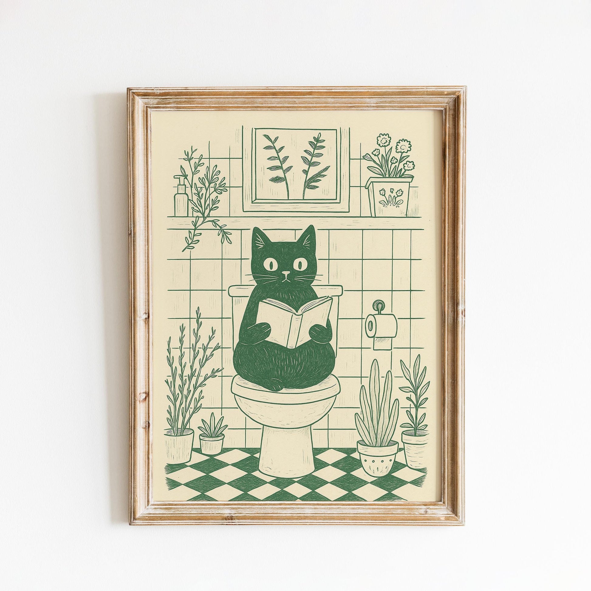 Bathroom Cat – Funny Minimal Line Art Poster, Cozy Bathroom Wall Decor
