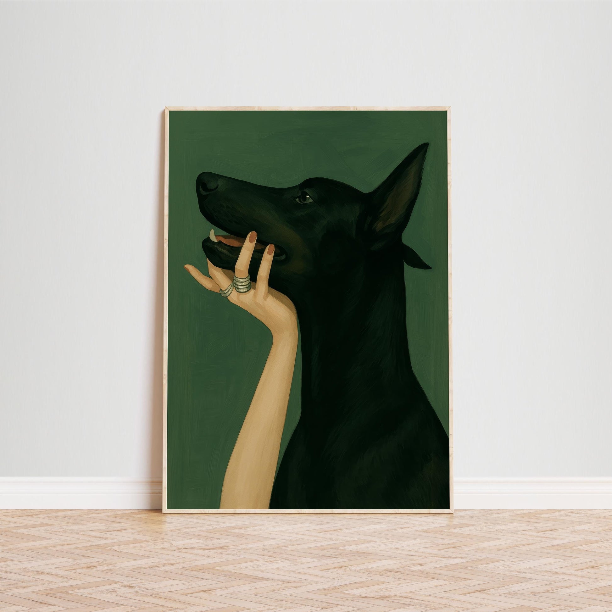 Black Dog Art Print – Witchy Wall Decor with Feminine Hand & Gothic Animal Art