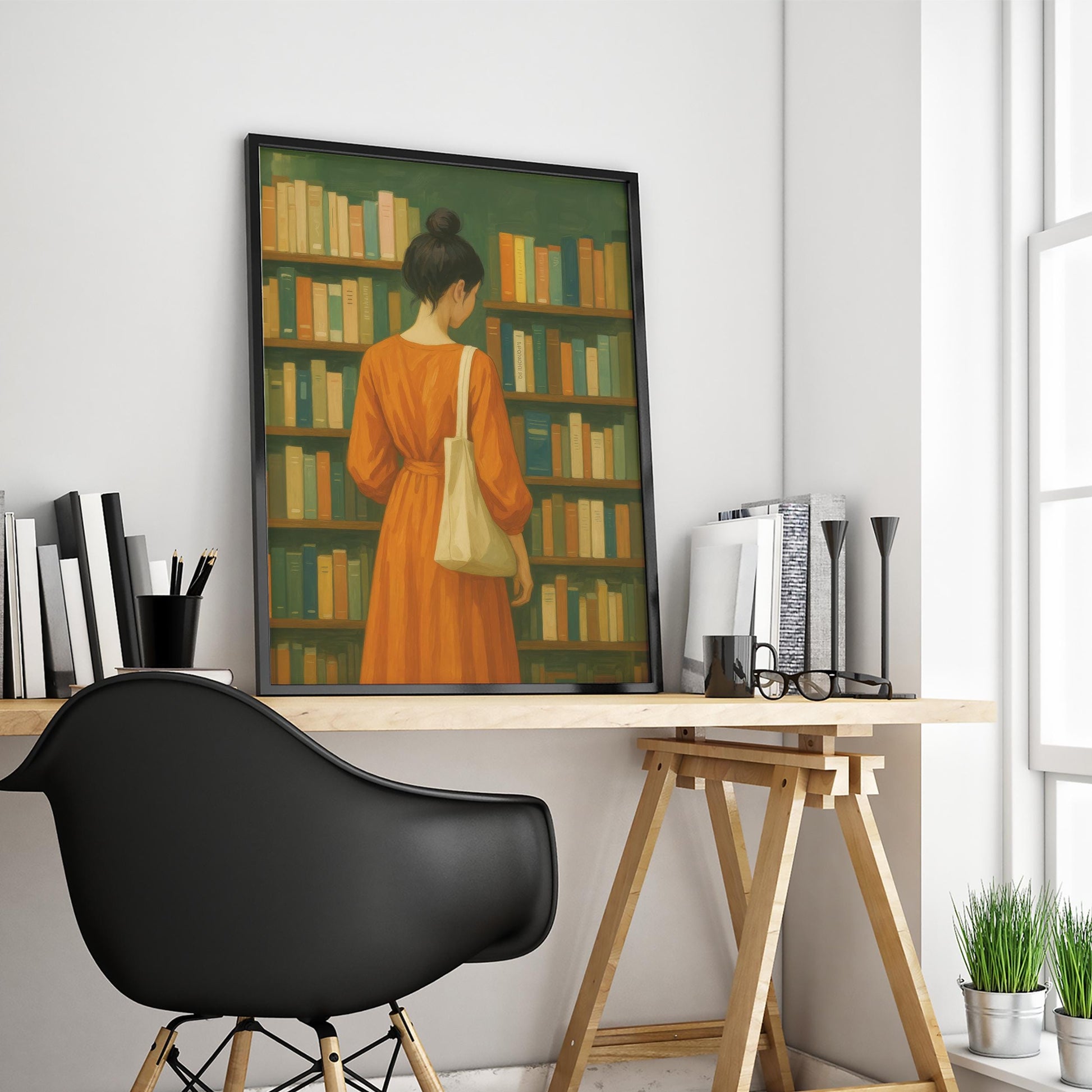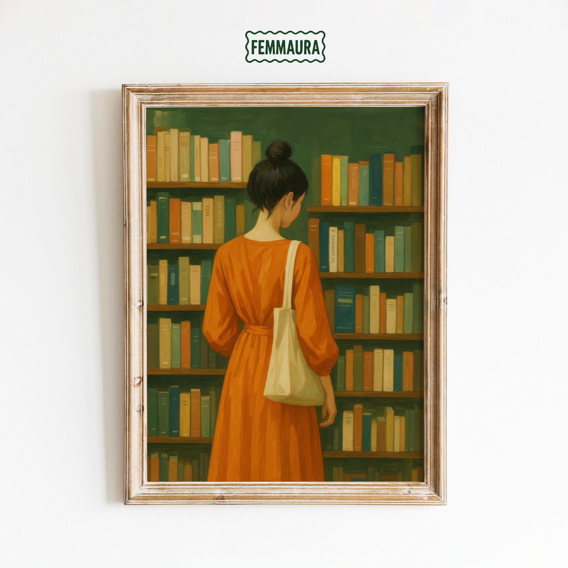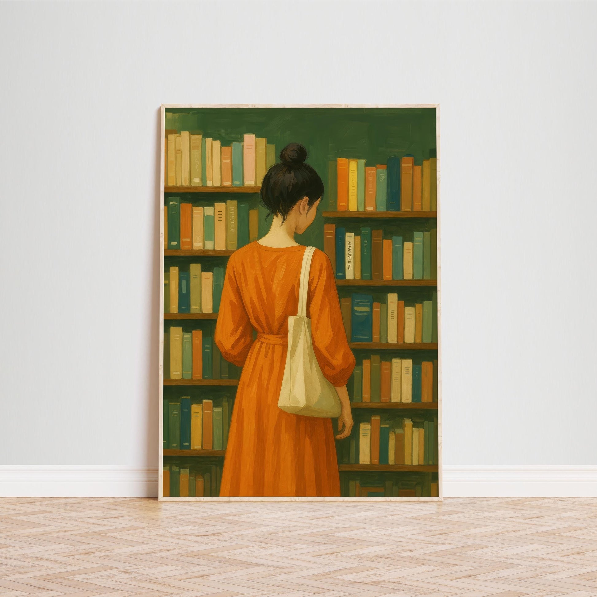 Bookstore Girl Poster – Quiet Reading Art | Orange Dress, Cozy Library Wall Print