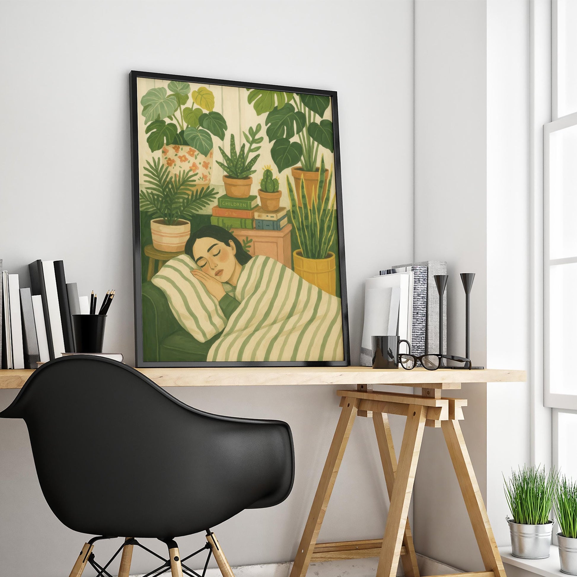 Botanical Bedroom Art – Cozy Green Wall Decor With Sleeping Girl Illustration
