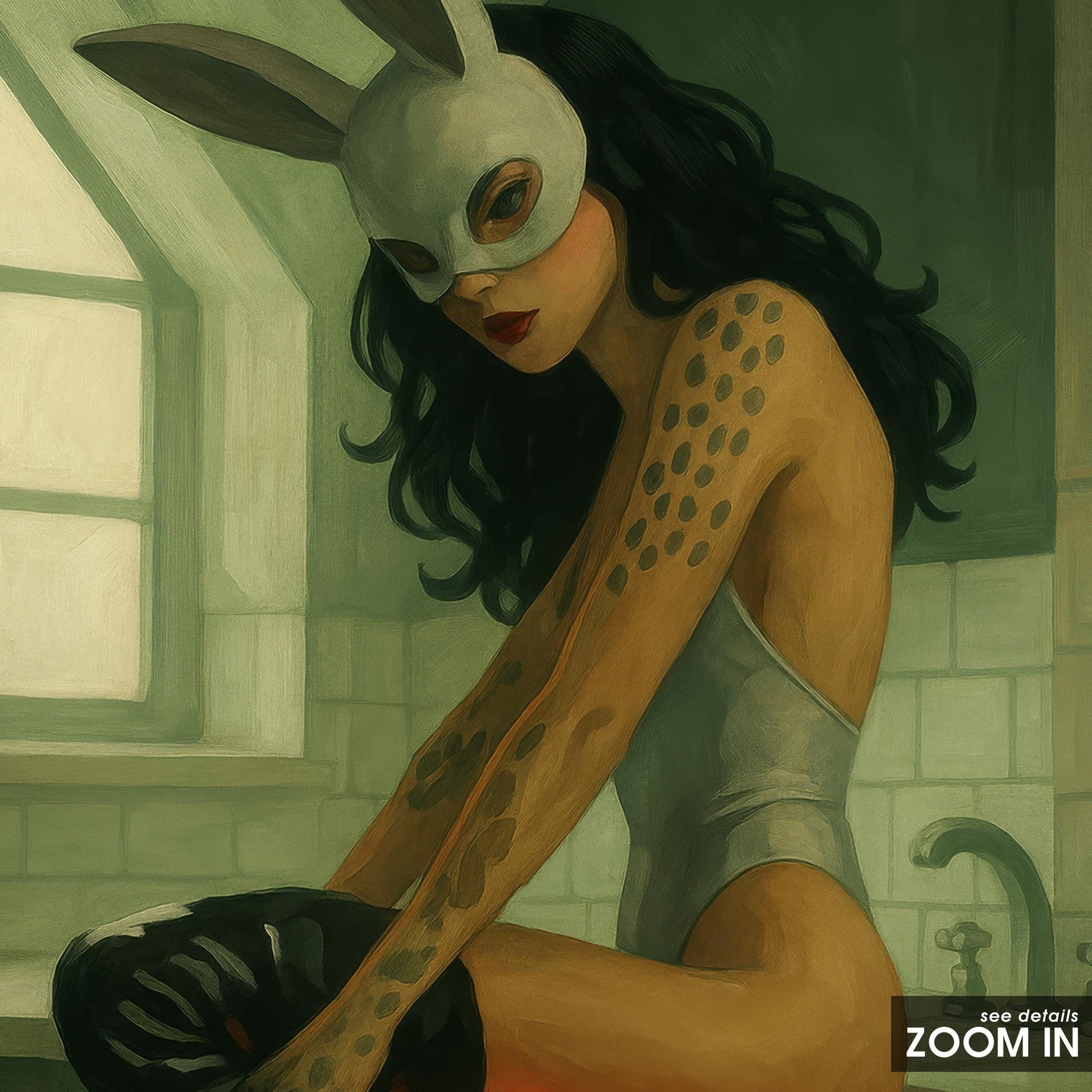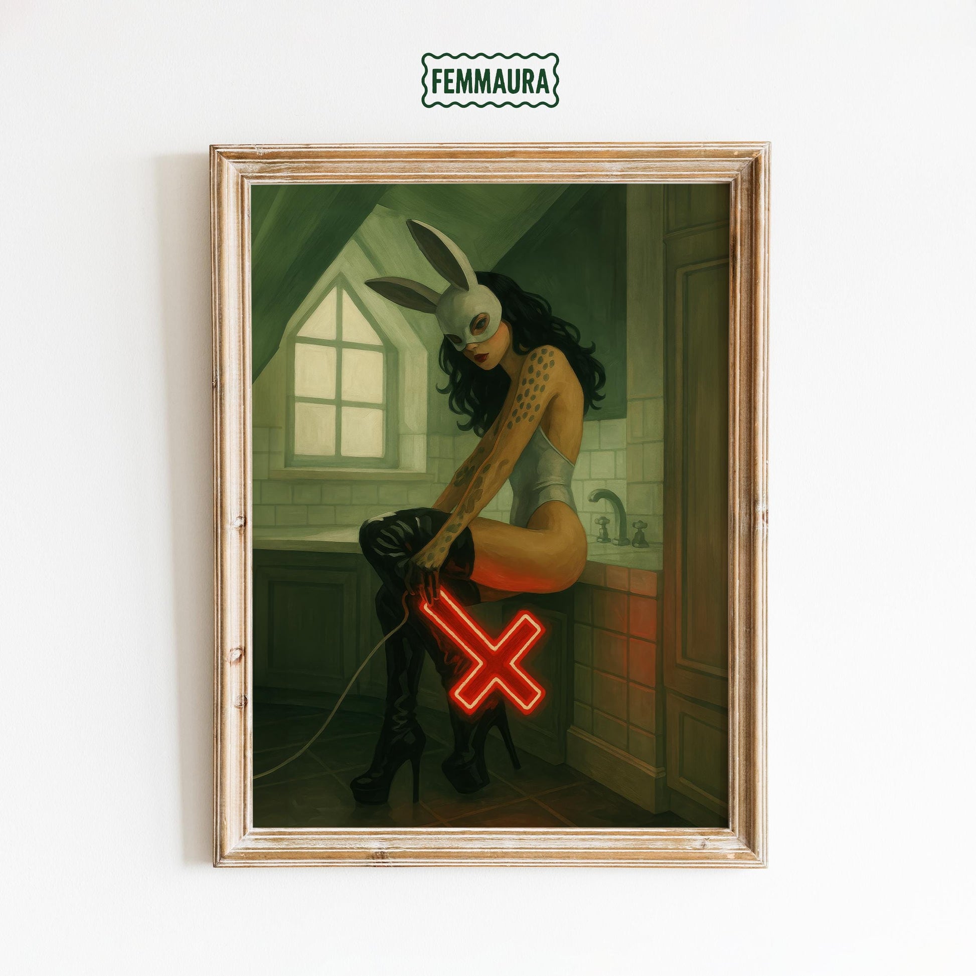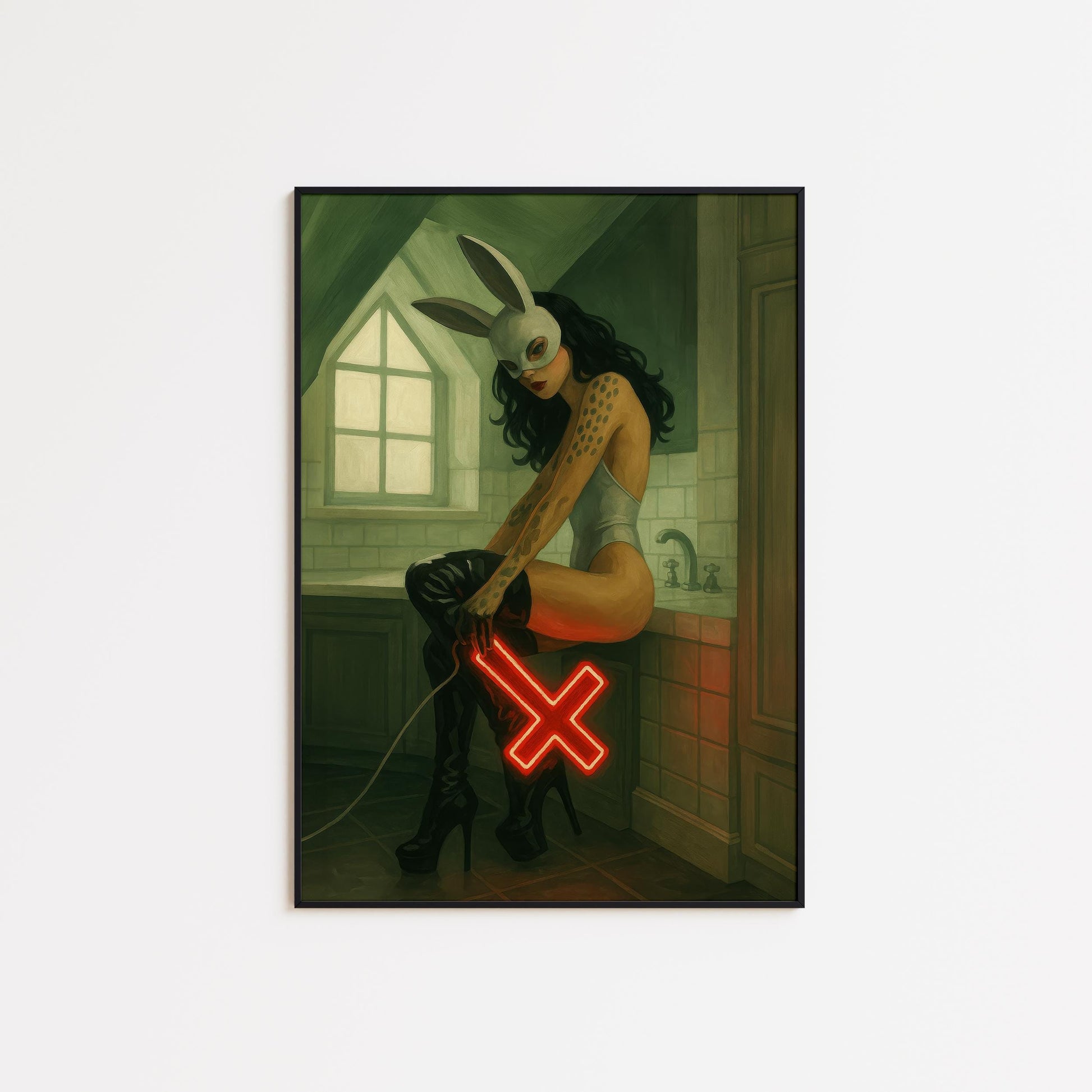 Bunny Mask Art Print – Neon Cross Retro Woman Poster | Edgy Alternative Wall Decor