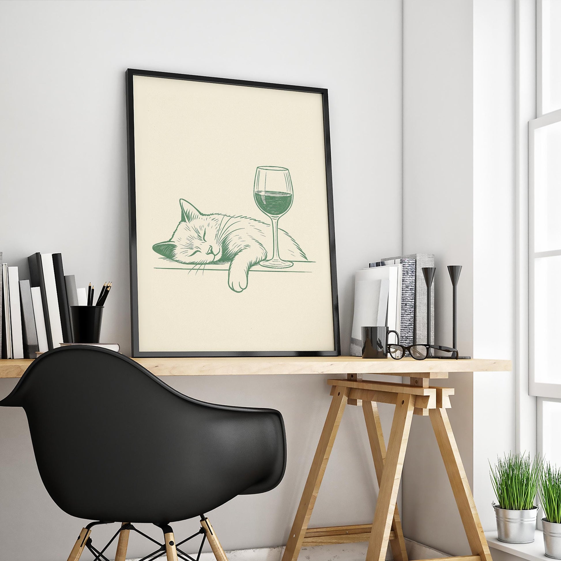 Cat and Wine Poster – Funny Minimalist Line Art, Cozy Retro Wall Art for Home