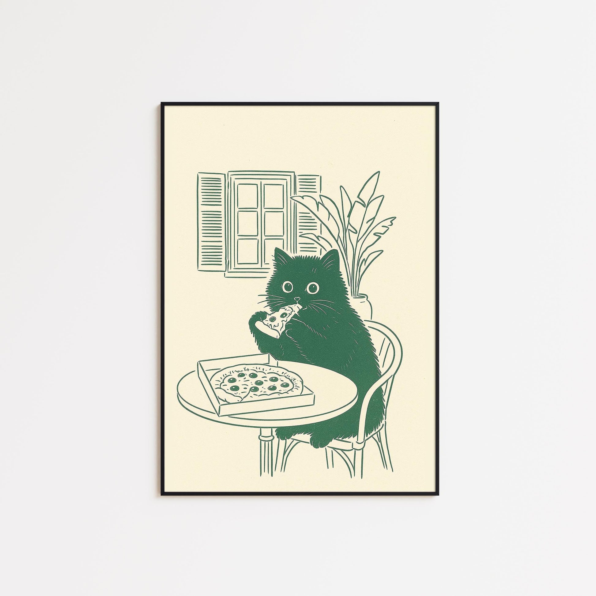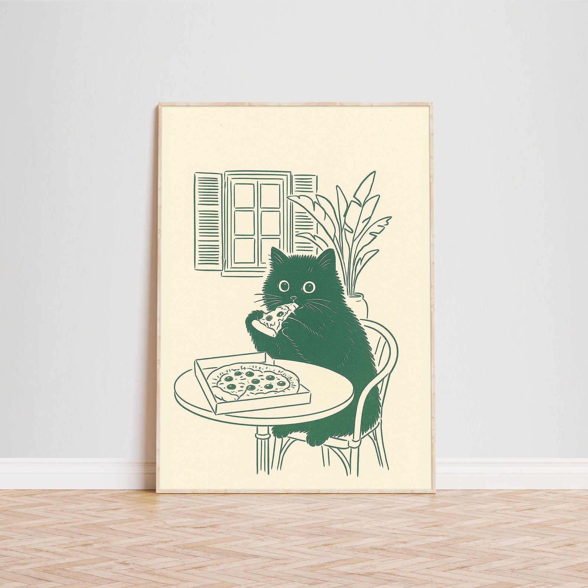 Cat Eating Pizza Poster – Funny Minimal Kitchen Wall Art