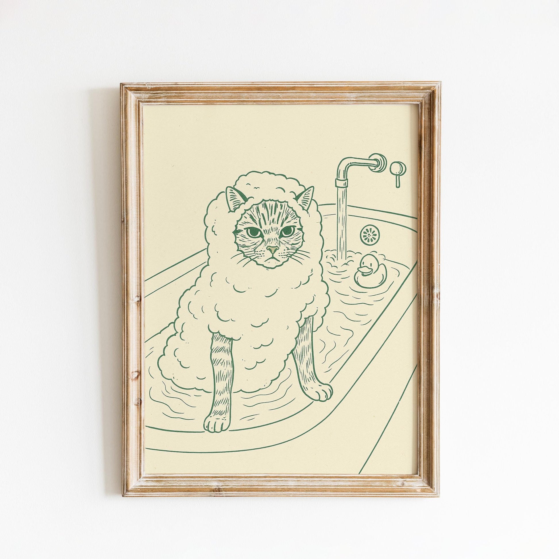 Cat in Bath Line Art Print – Minimalist Bathroom Wall Art, Funny Animal Poster