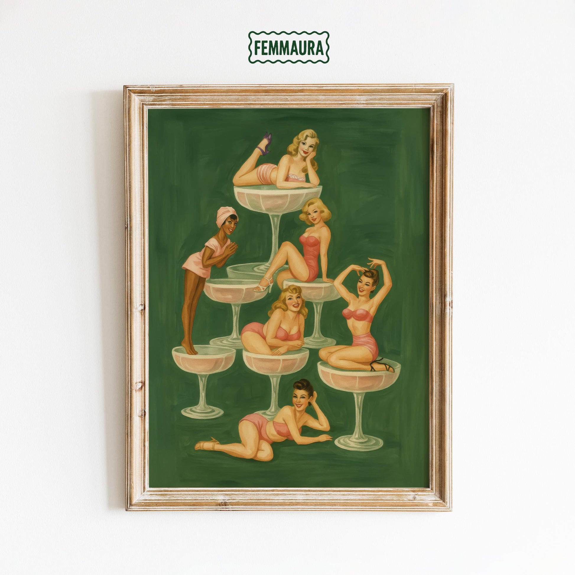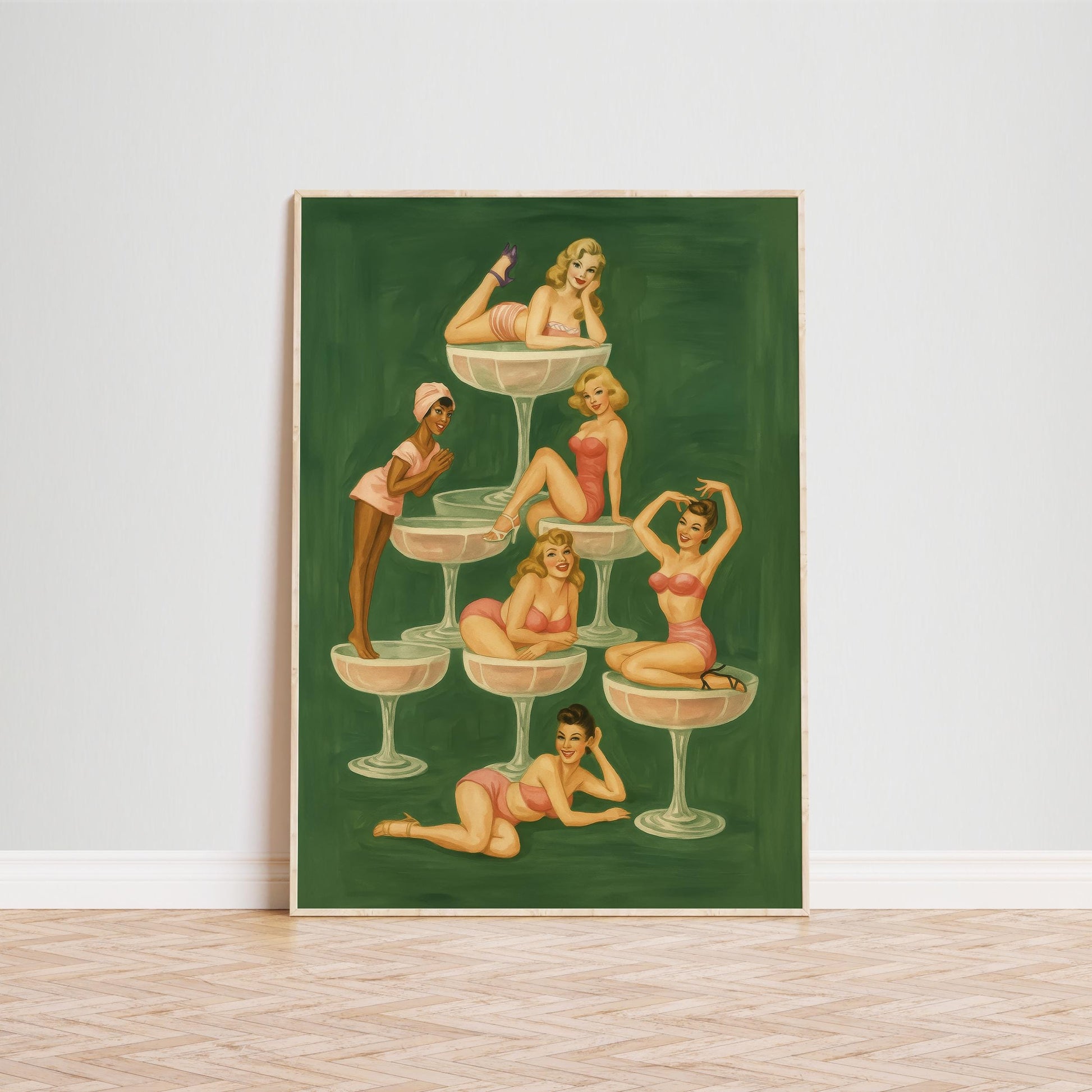 Champagne Tower Poster – Vintage Pinup Art | Playful Feminine Group Print