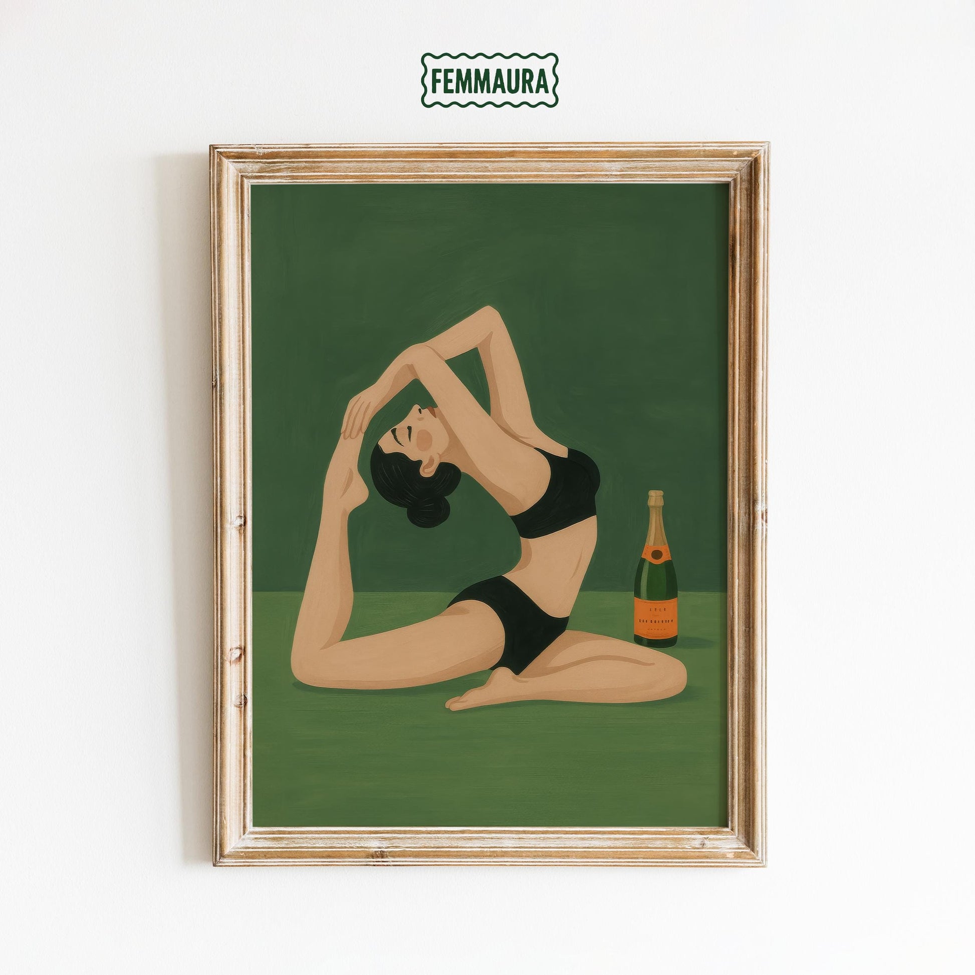 Champagne Yoga Art Print – Playful Retro Woman Poster | Green Wall Decor