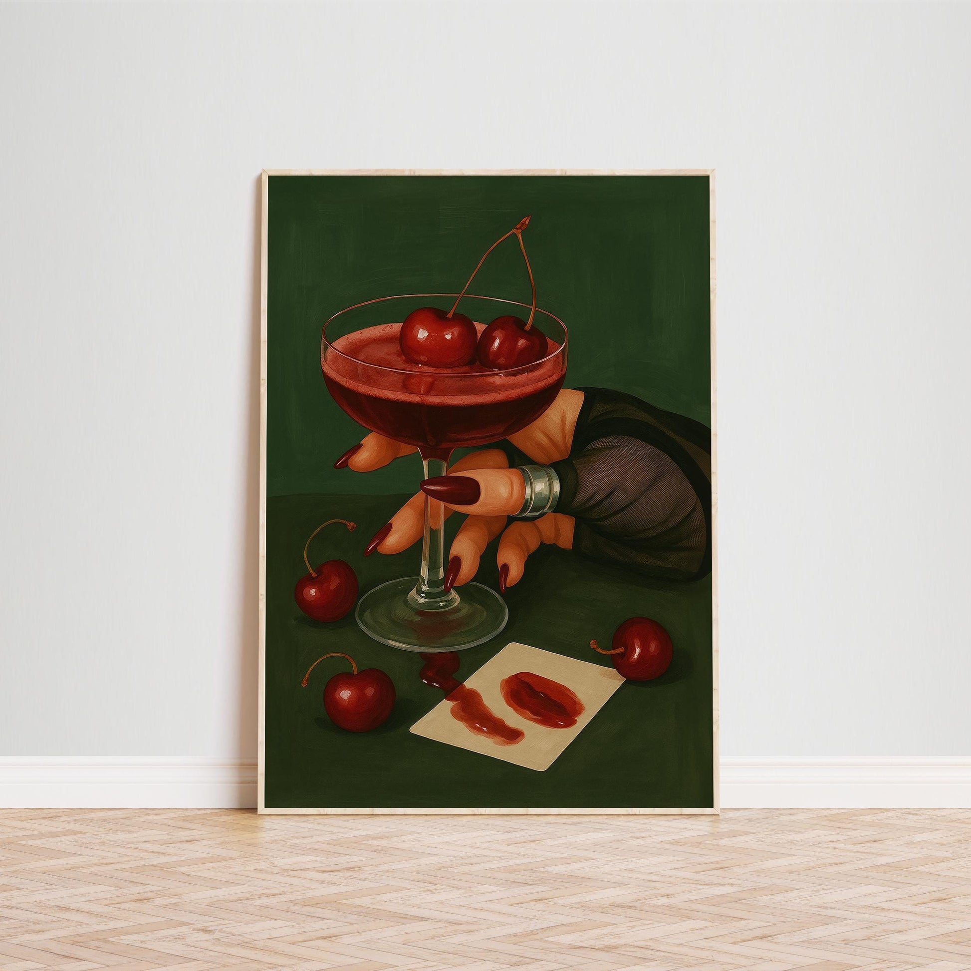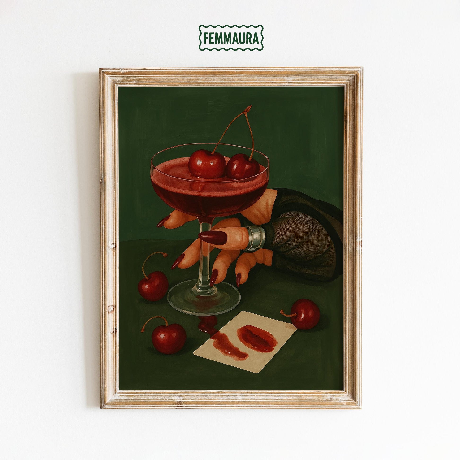 Cherry Cocktail Art Print – Vintage Noir Sensual Wall Art | Digital Download