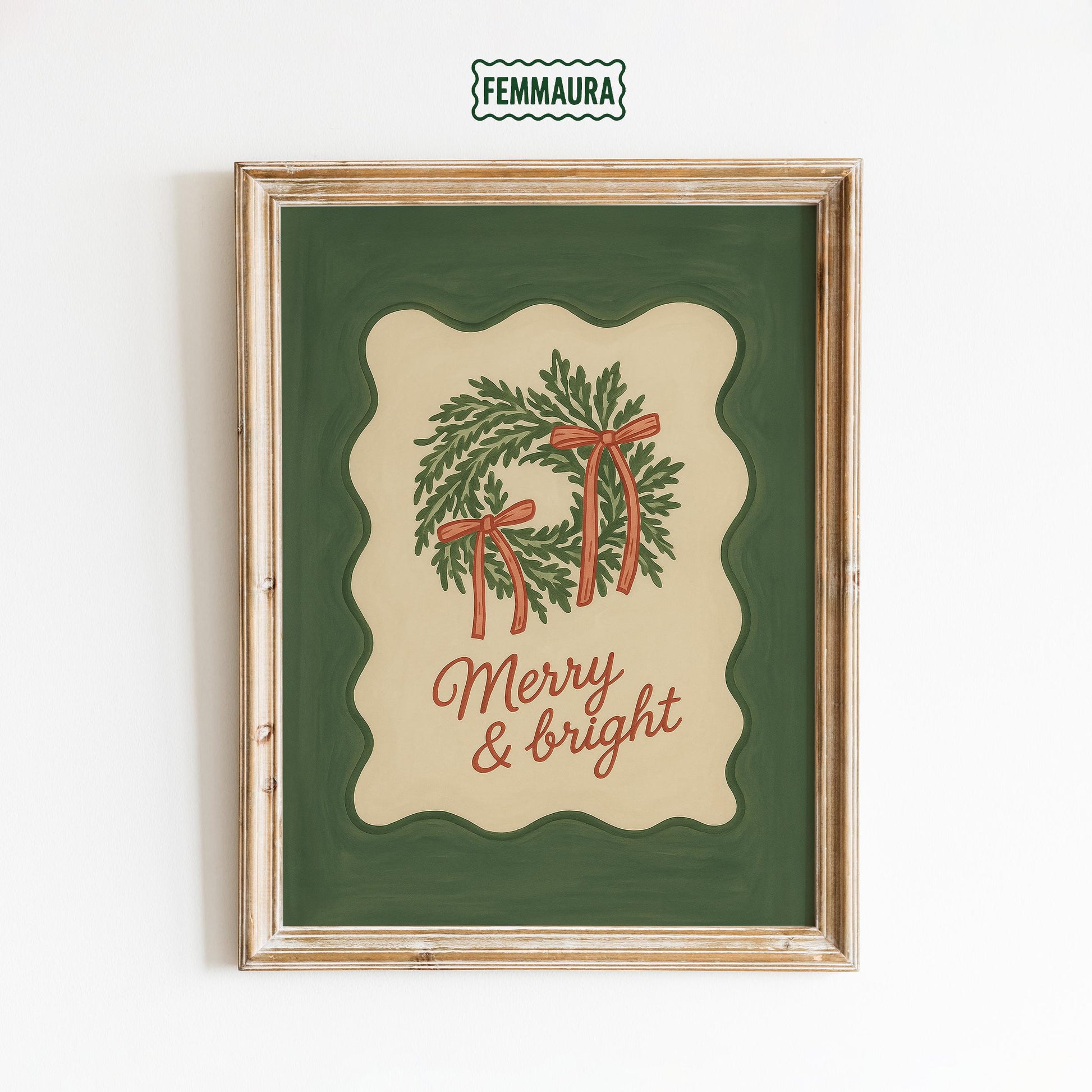 Christmas Wall Art – Merry & Bright Retro Green Holiday Poster
