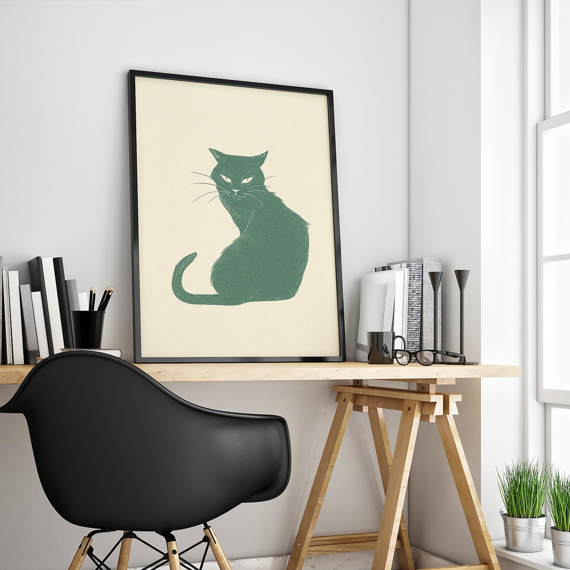 Confident Cat Poster – Minimal Line Art Print, Moody Green Feline Wall Decor