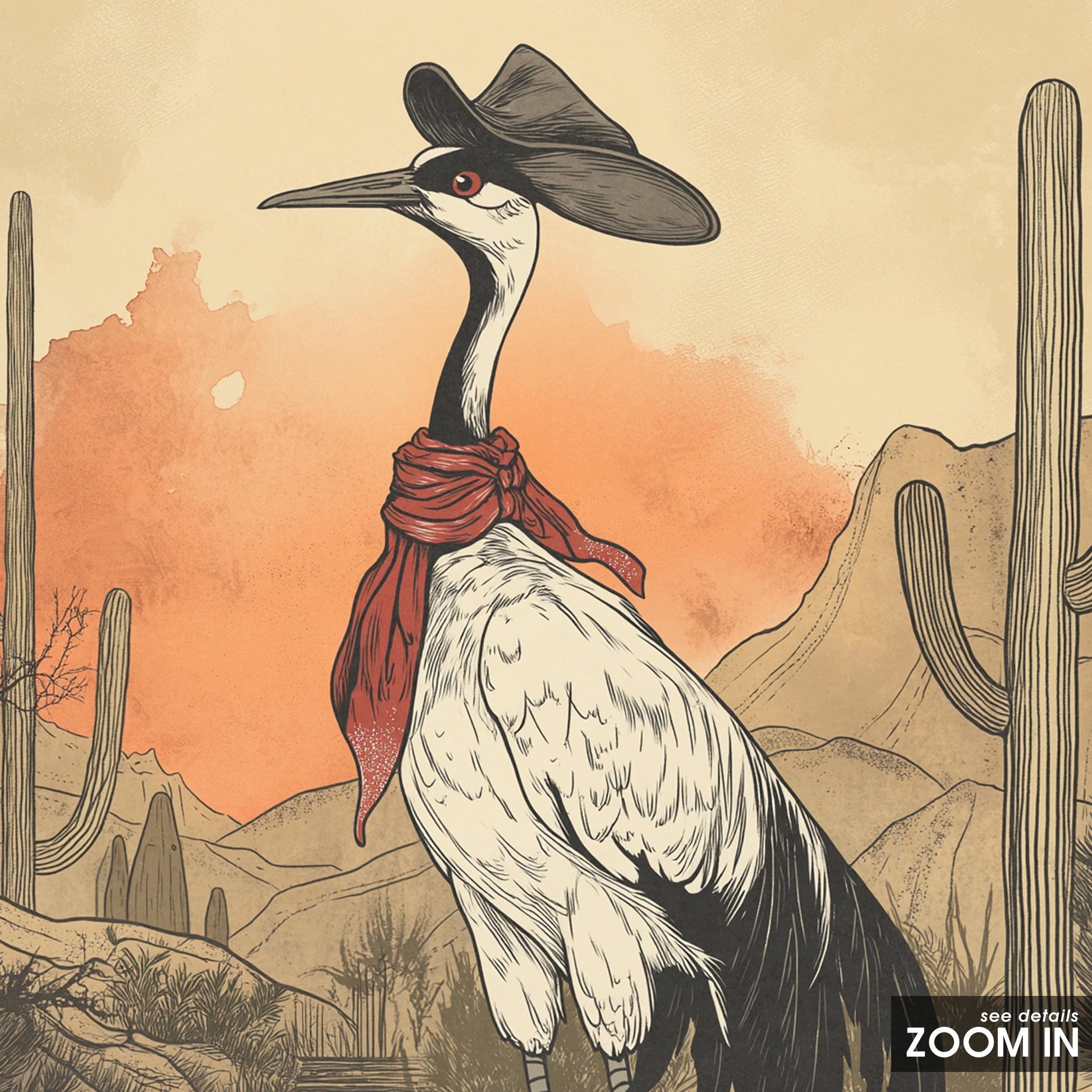 Cowboy Crane Poster – East-West Surreal Bird Art in Desert Oasis