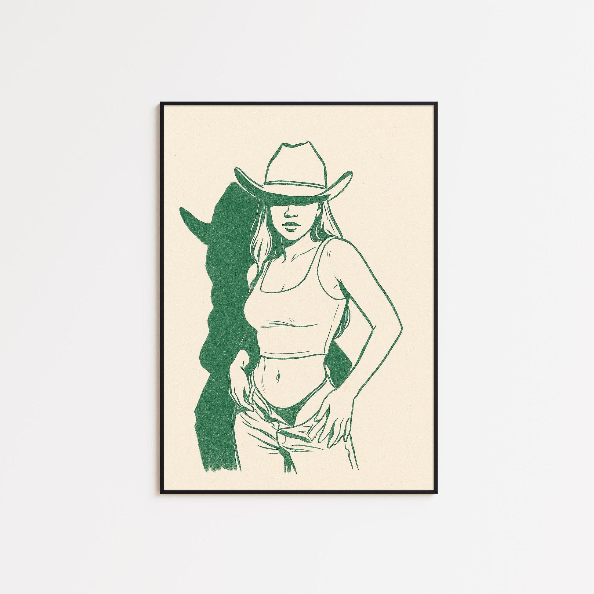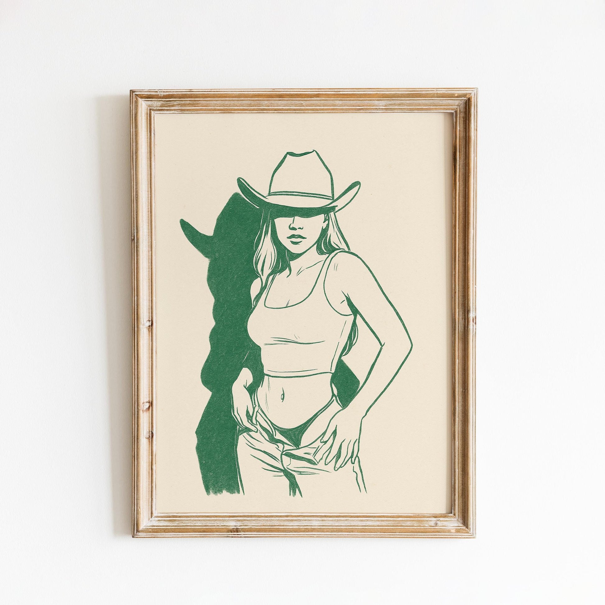 Cowgirl Shadow Poster – Minimal Green Line Western Wall Art