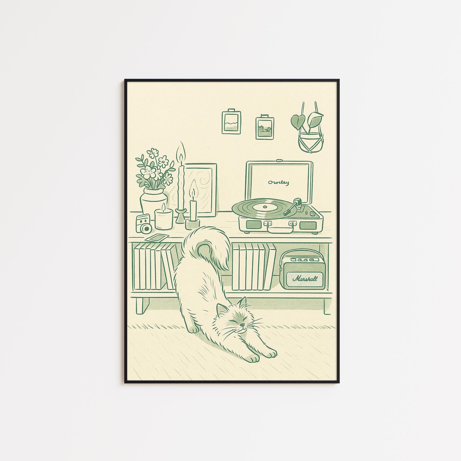 Cozy Cat and Vinyl Poster – Retro Minimal Line Art, Warm Home Decor