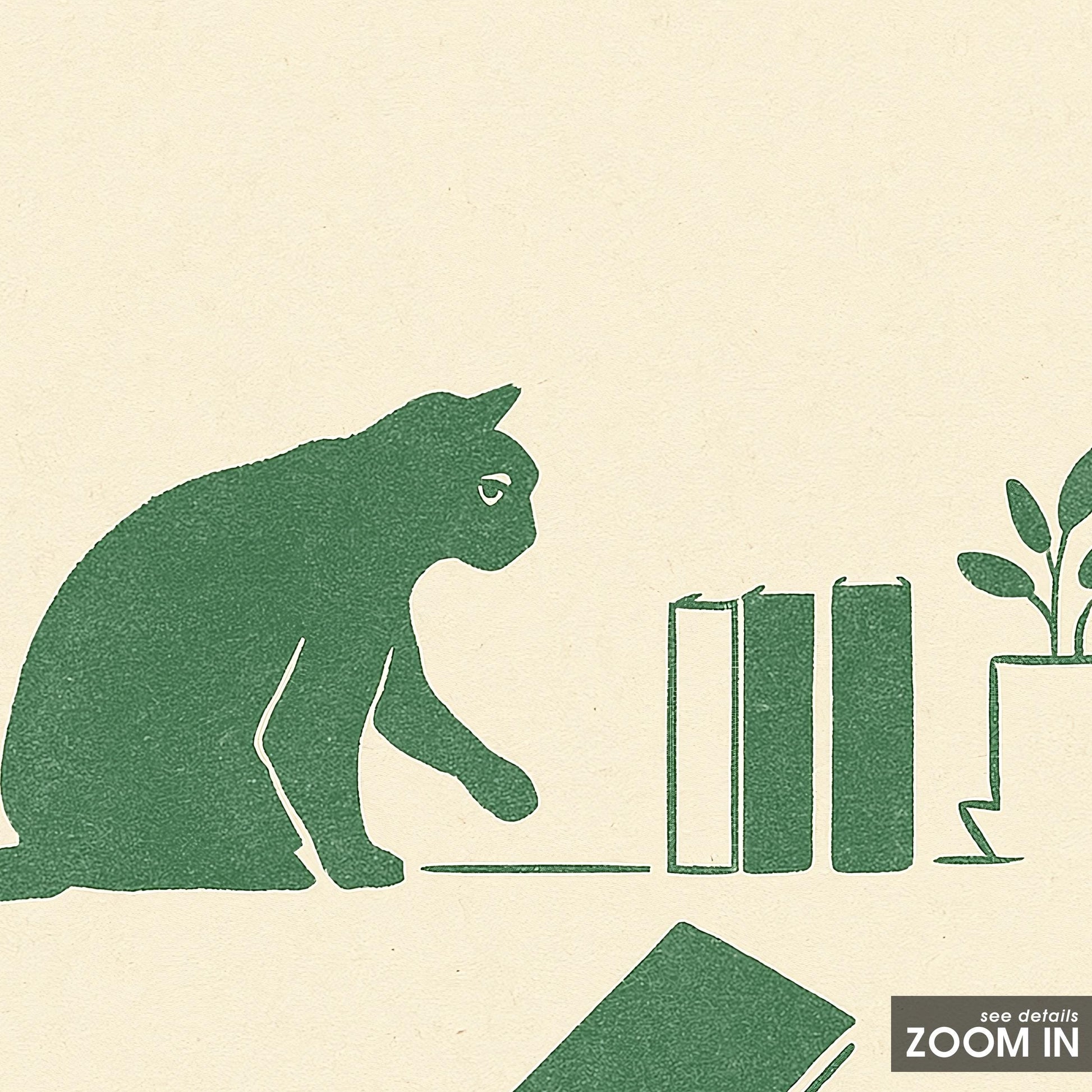 Curious Cat and Books – Minimal Line Art Poster, Cozy Literary Wall Print