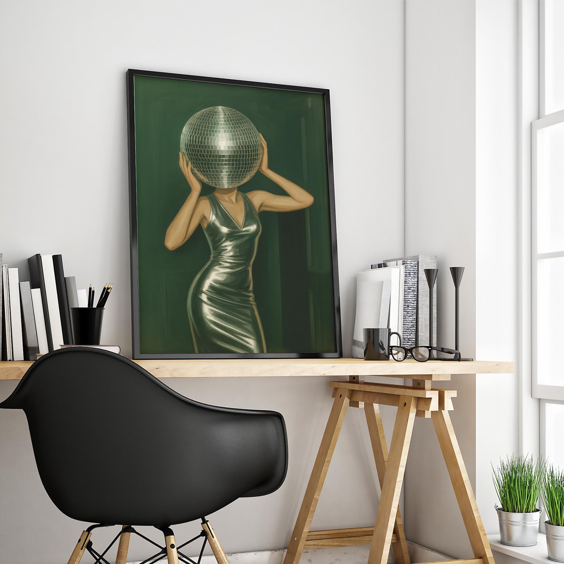 Disco Ball Poster – Retro Party Art with Metallic Dress & Green Background Print