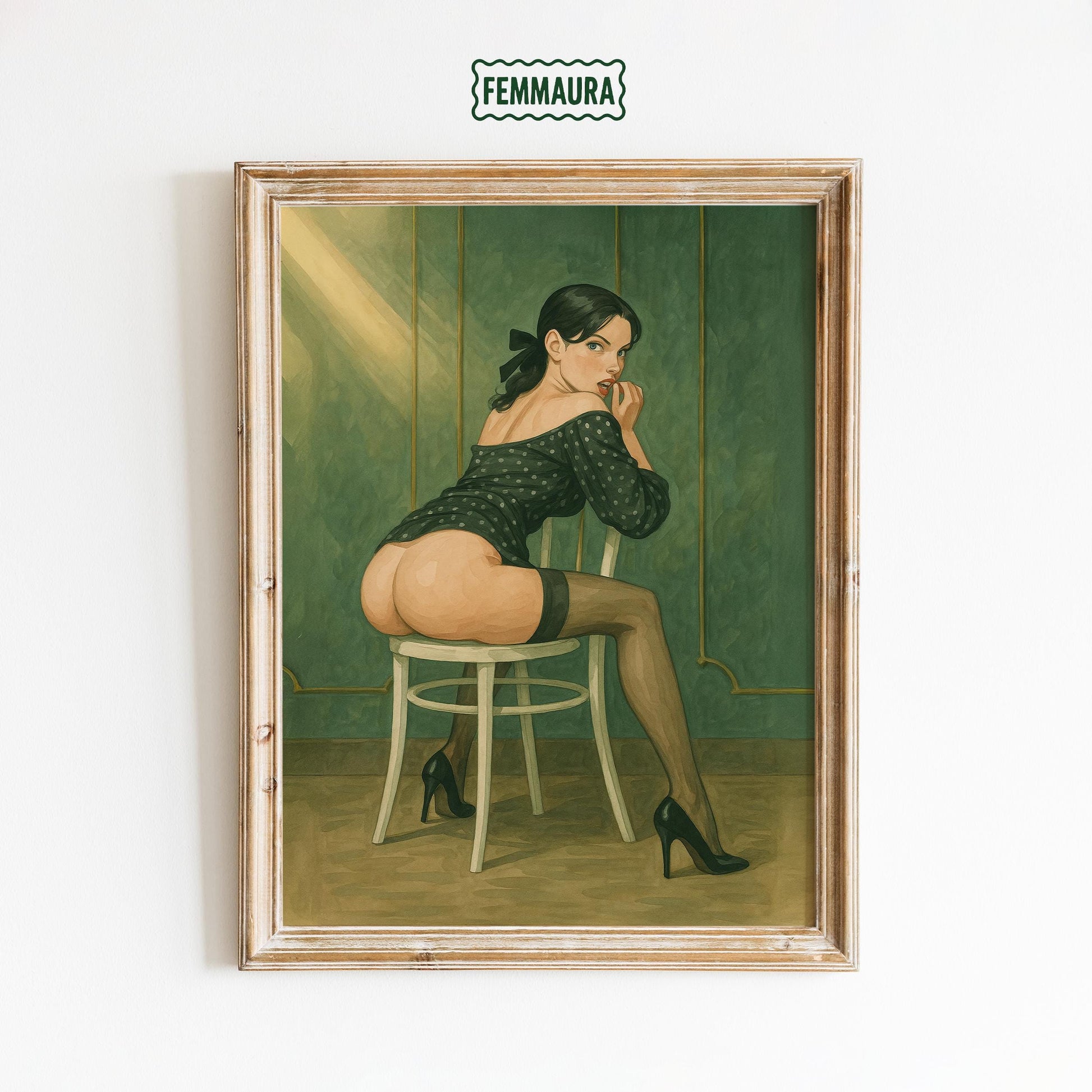 Feminine Pin-Up Art – Vintage Style Print | Green Wall Art & Sensual Woman Poster