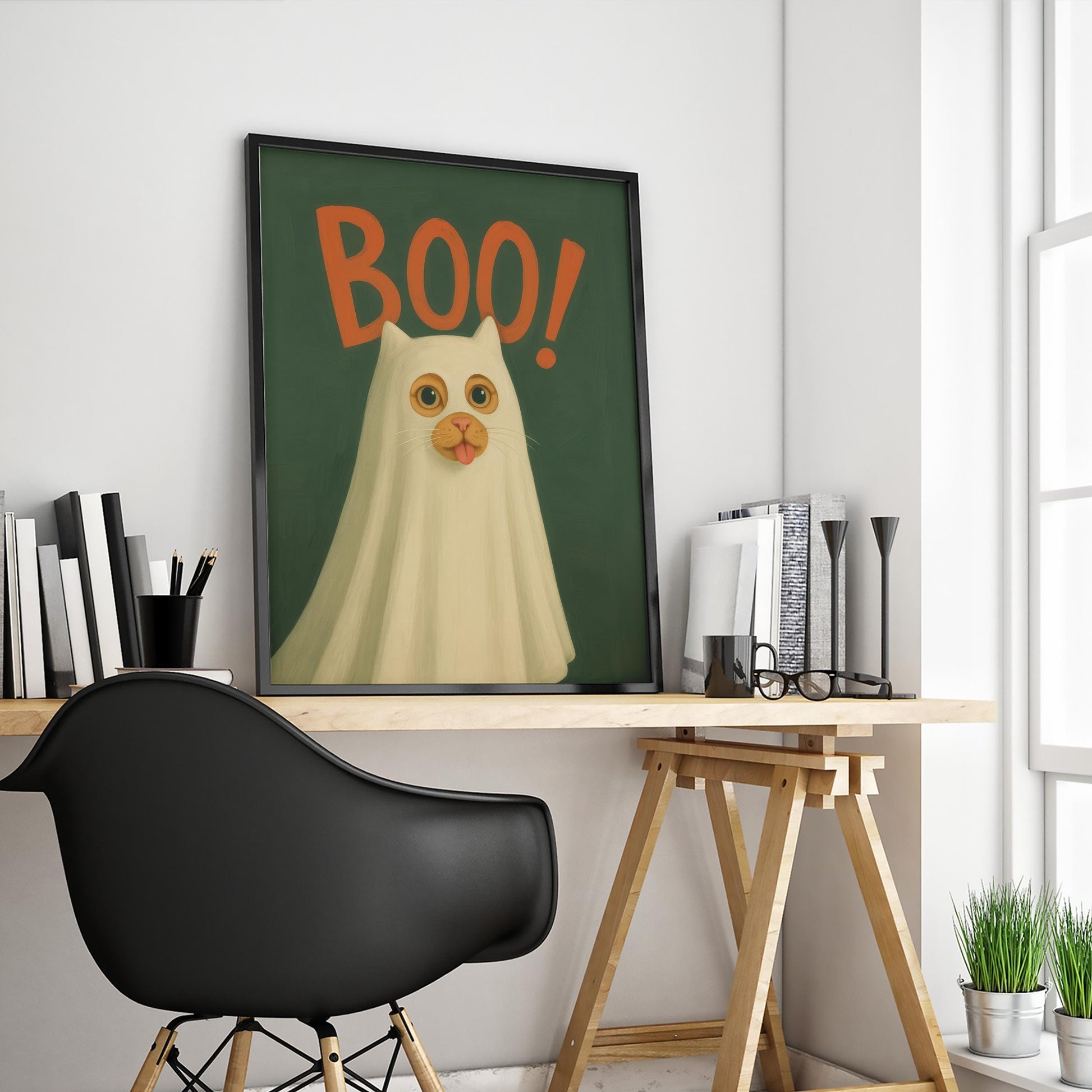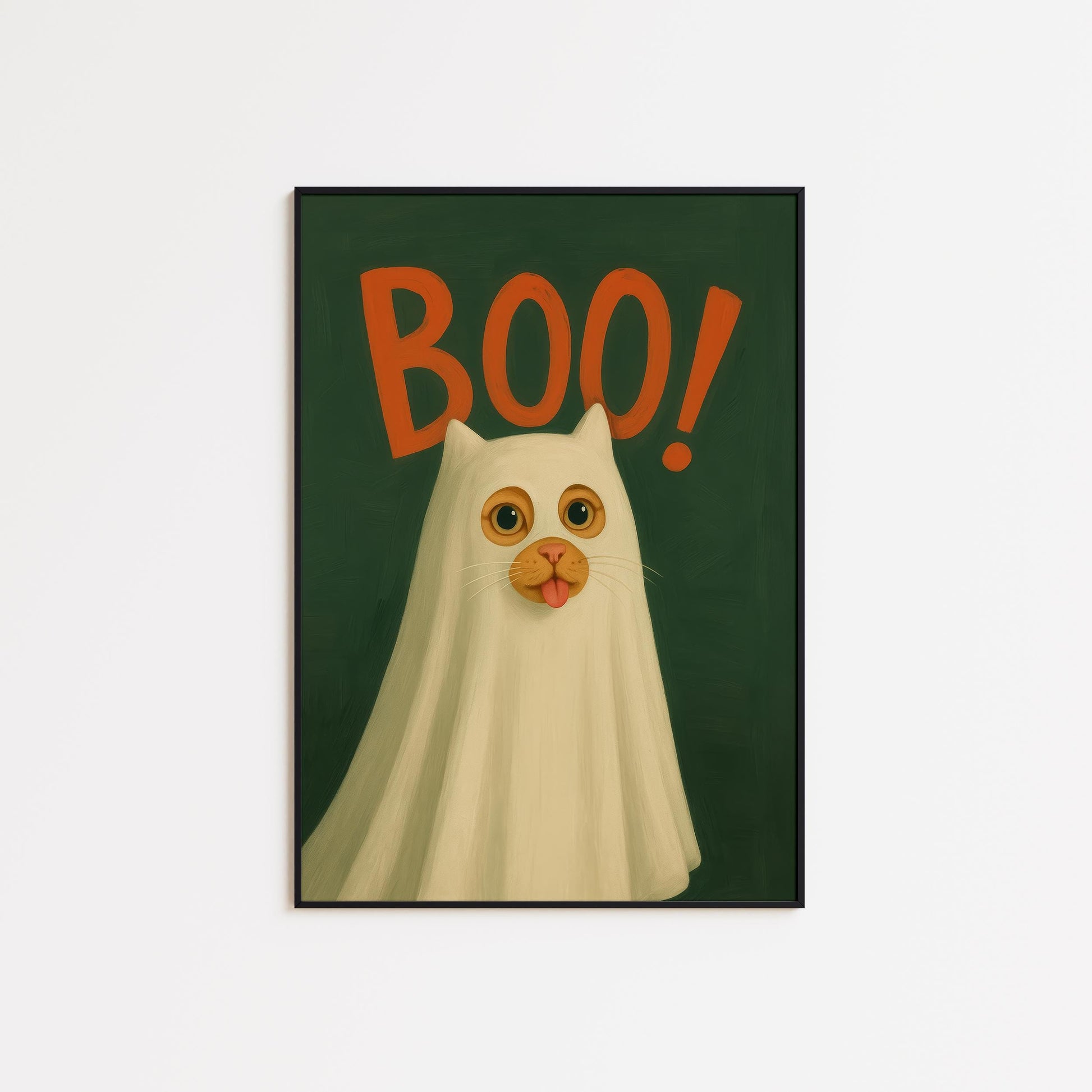 Ghost Cat Poster – Funny Halloween Wall Art | Playful Boo Cat Illustration