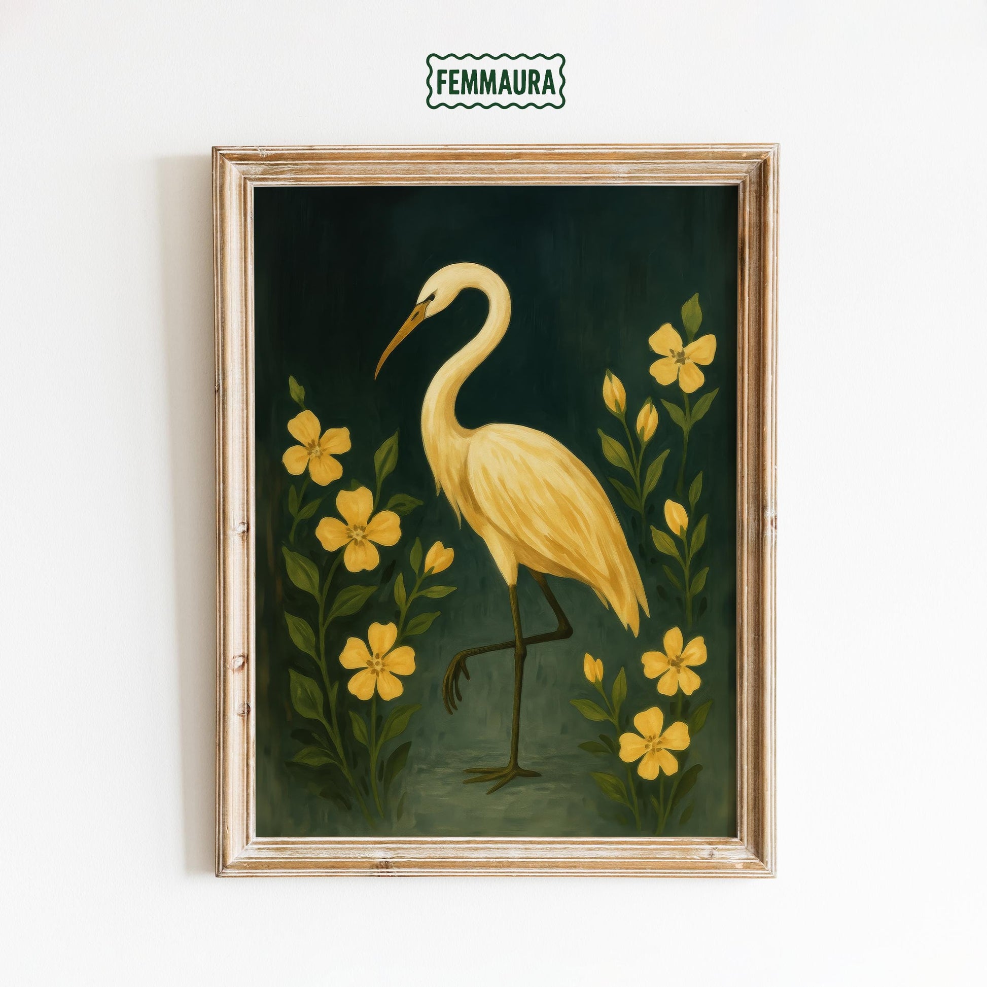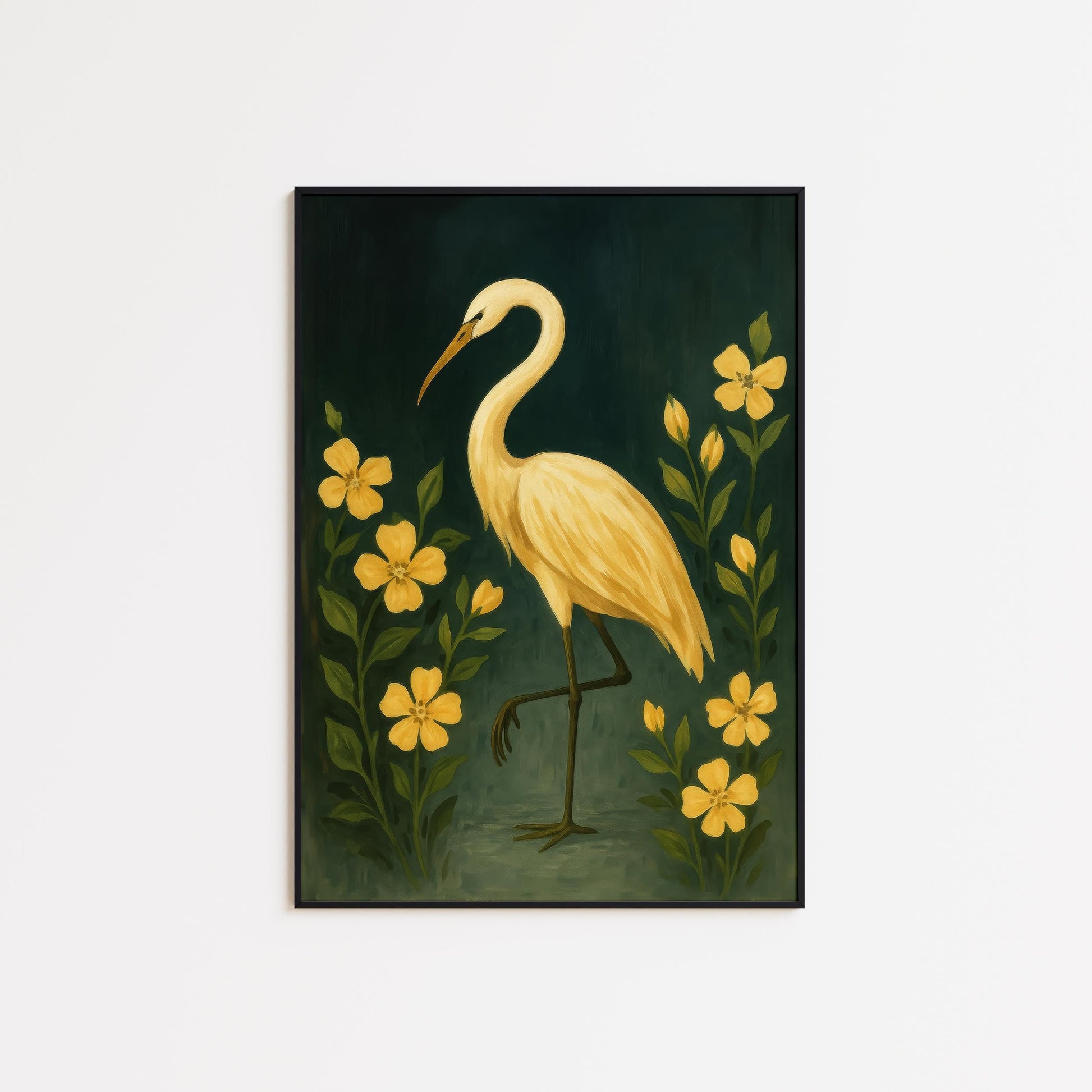 Golden Crane Wall Art – Elegant Floral Bird Artwork with Yellow Flowers
