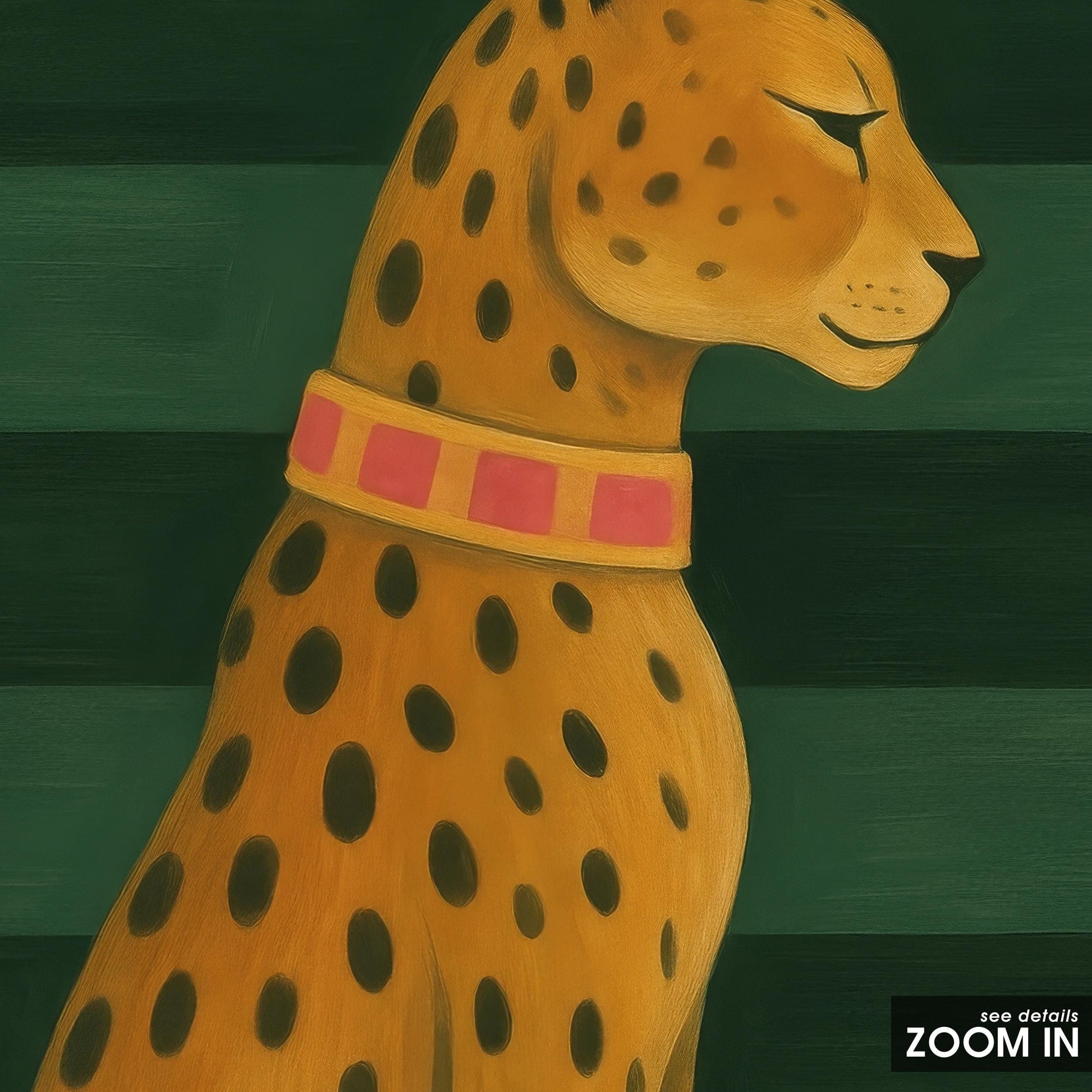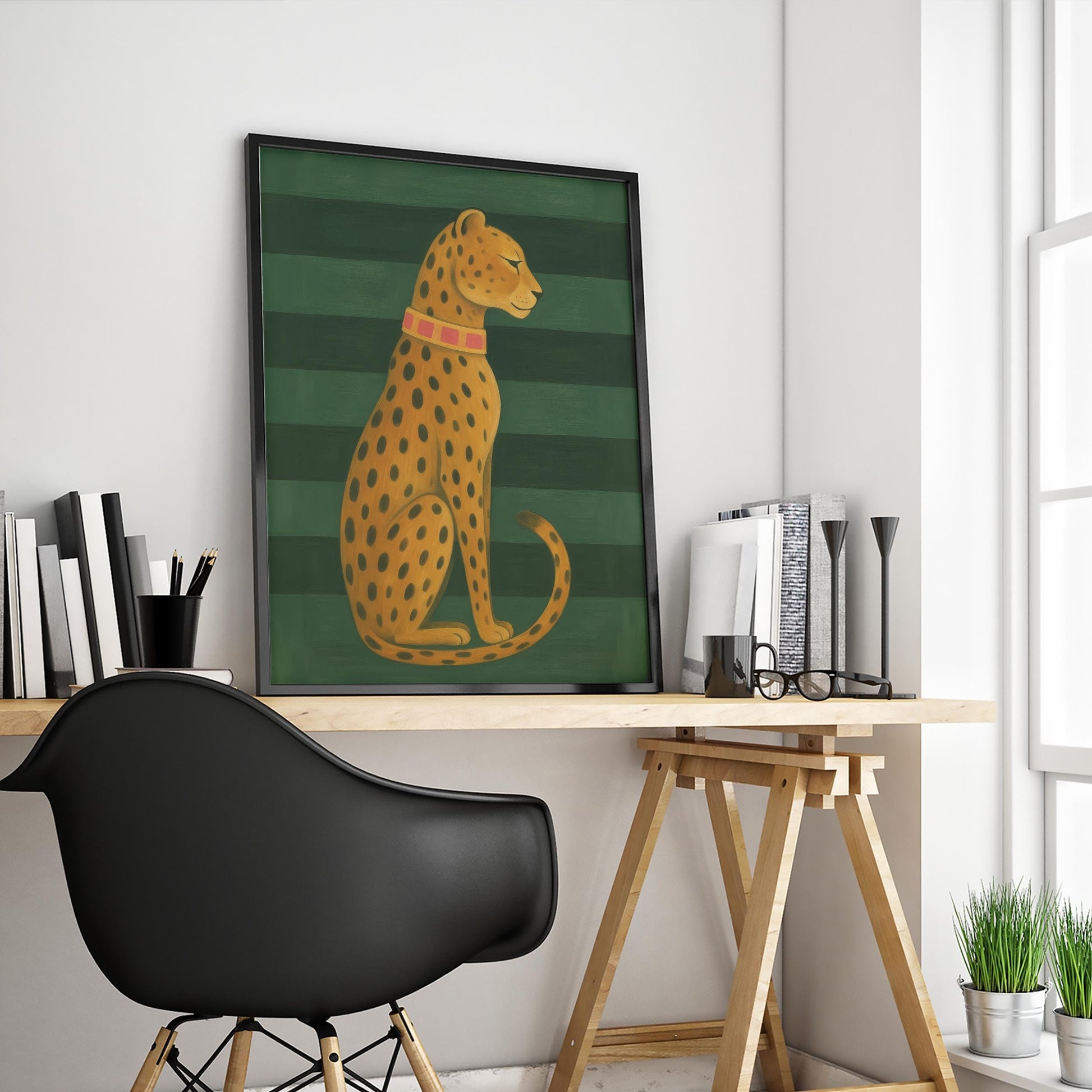 Golden Leopard Wall Art - Elegant Animal Print on Green Striped Poster