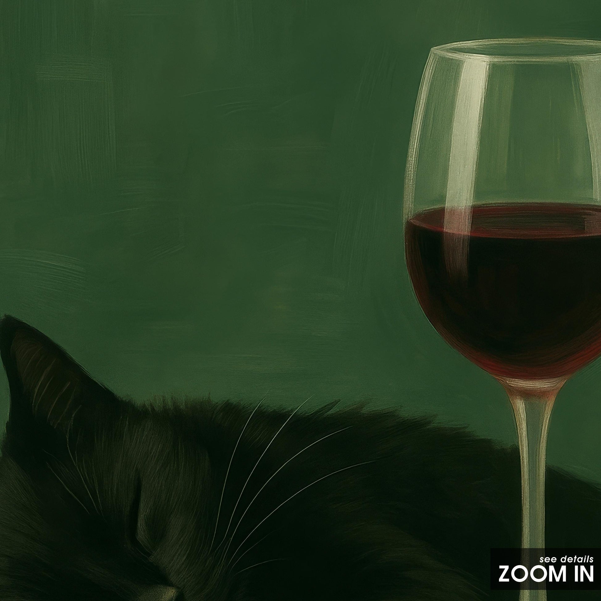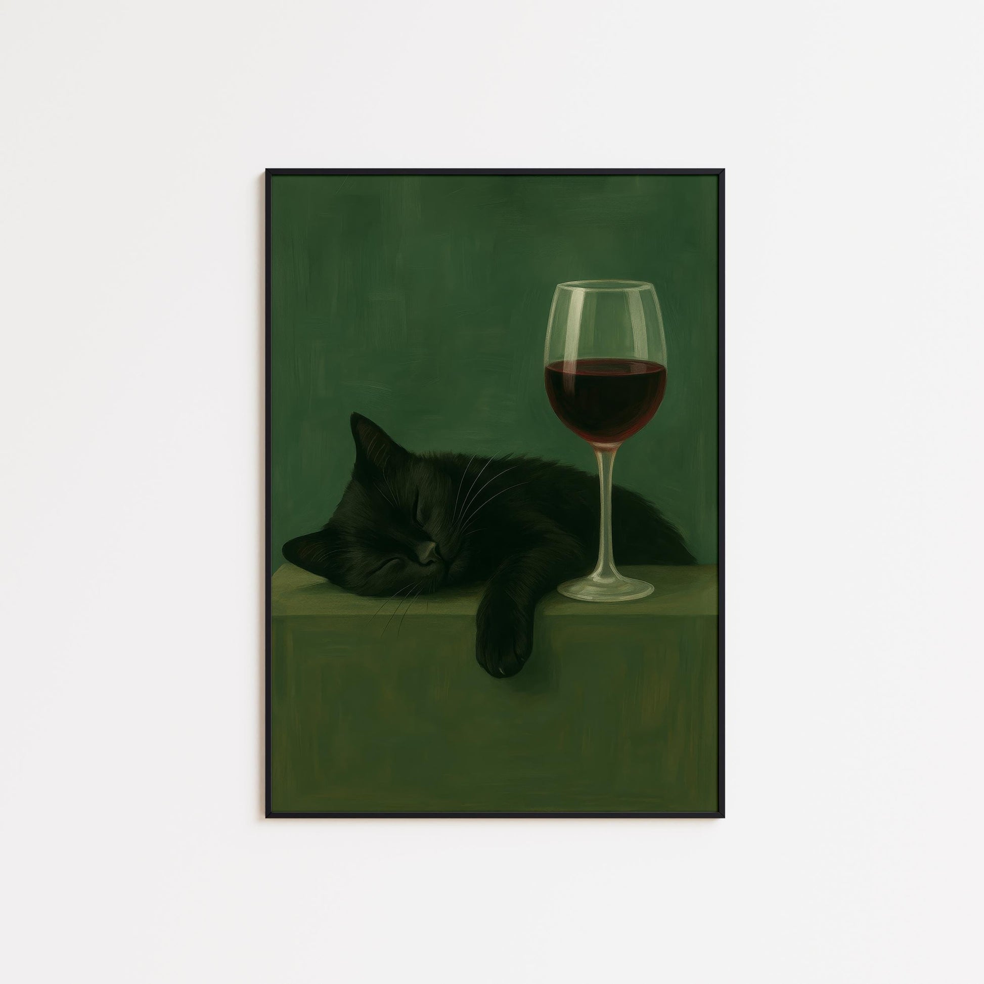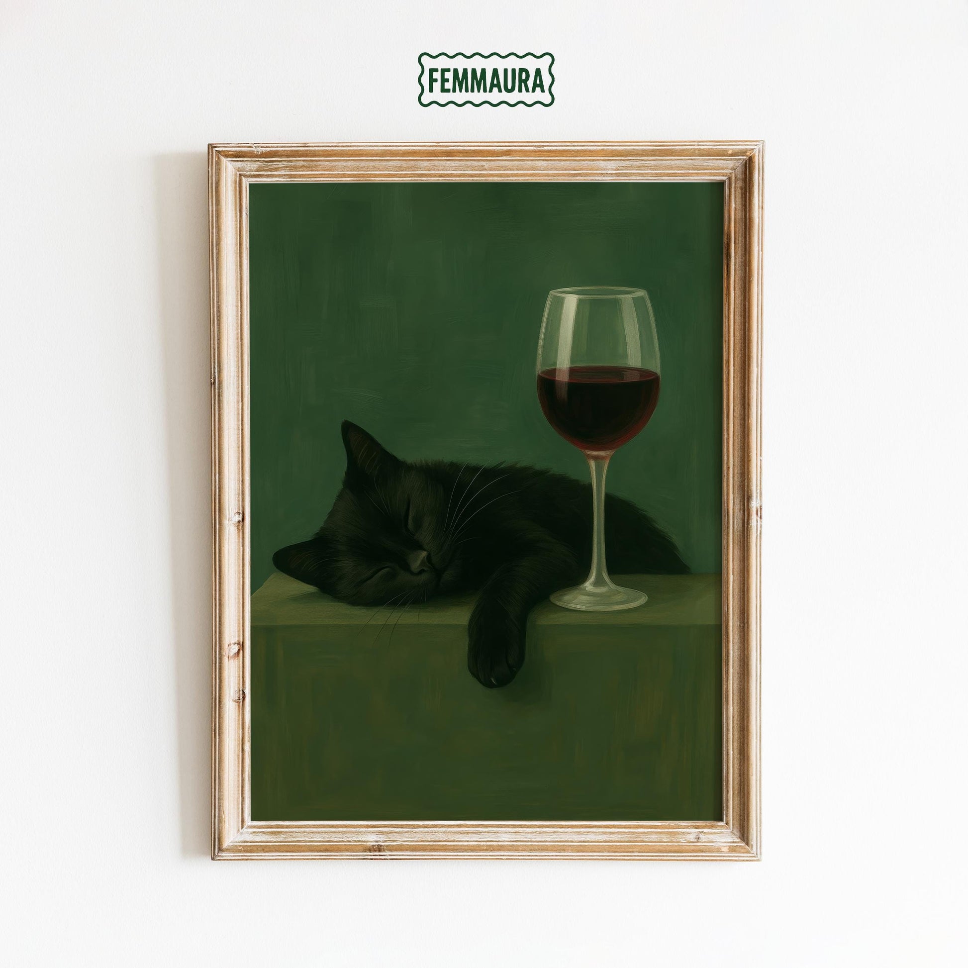 Gothic Cat Art Print – Moody Black Cat Wine Poster | Cozy Bar Decor