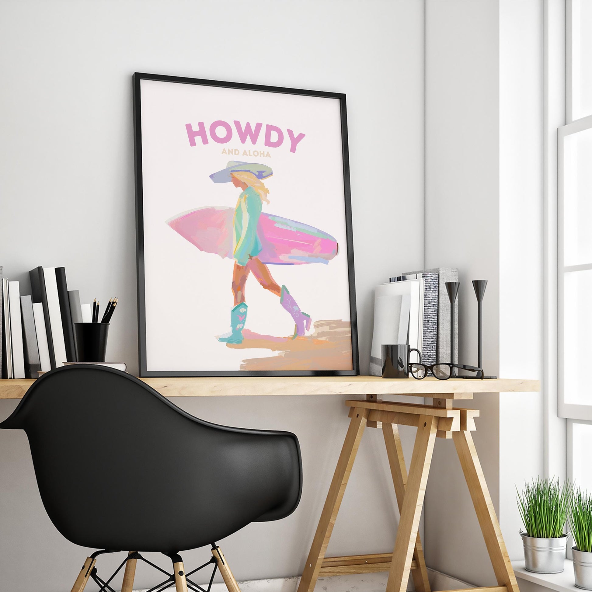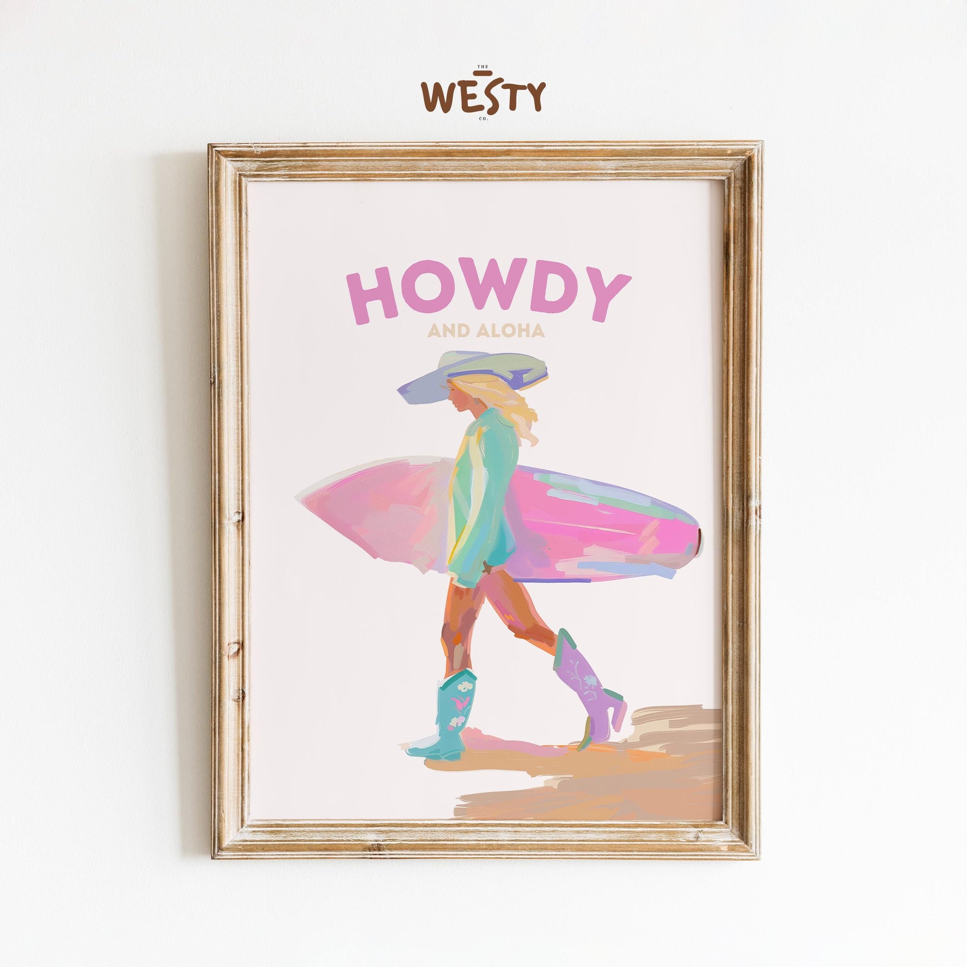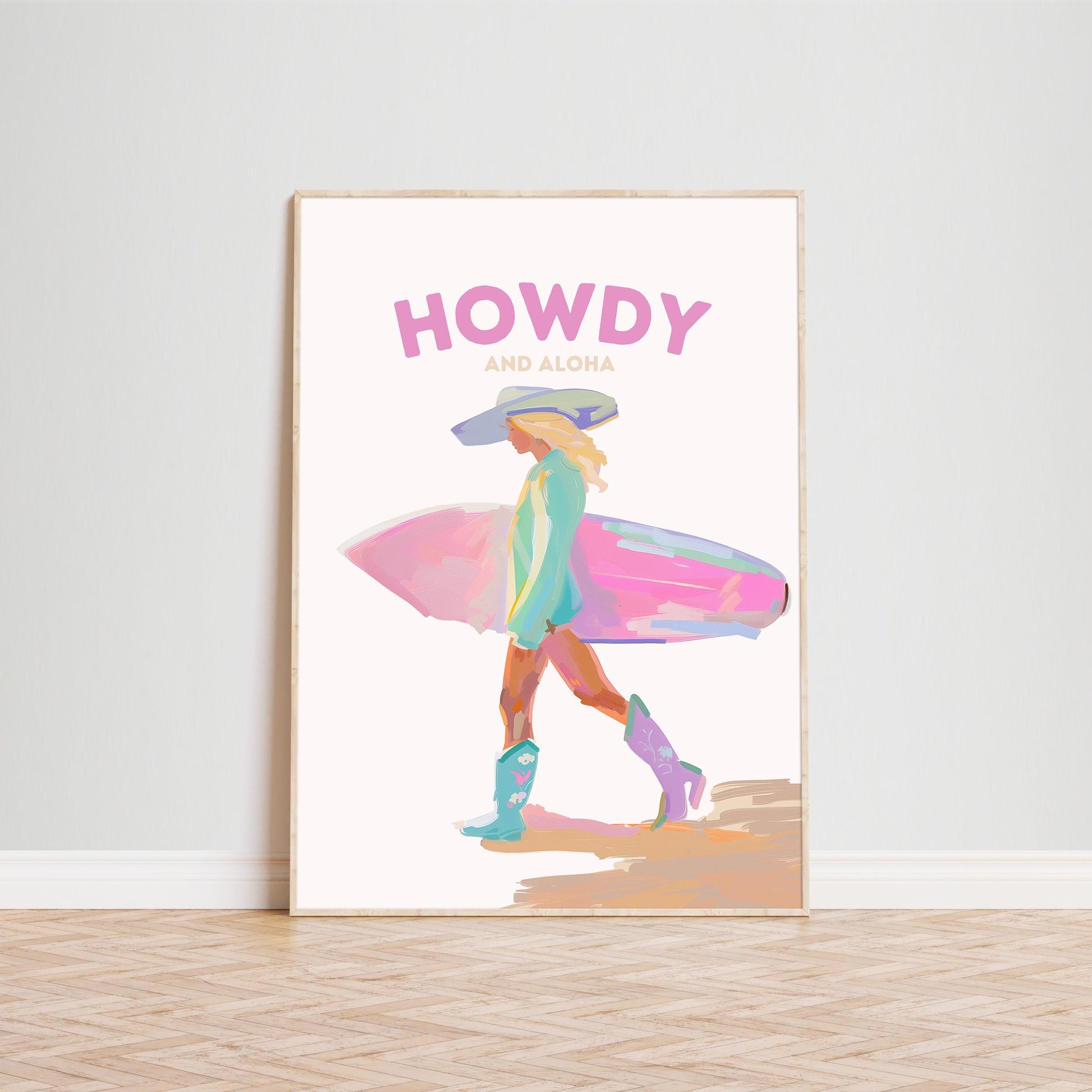 Howdy and Aloha Poster – Western Surfer Girl Pastel Wall Art