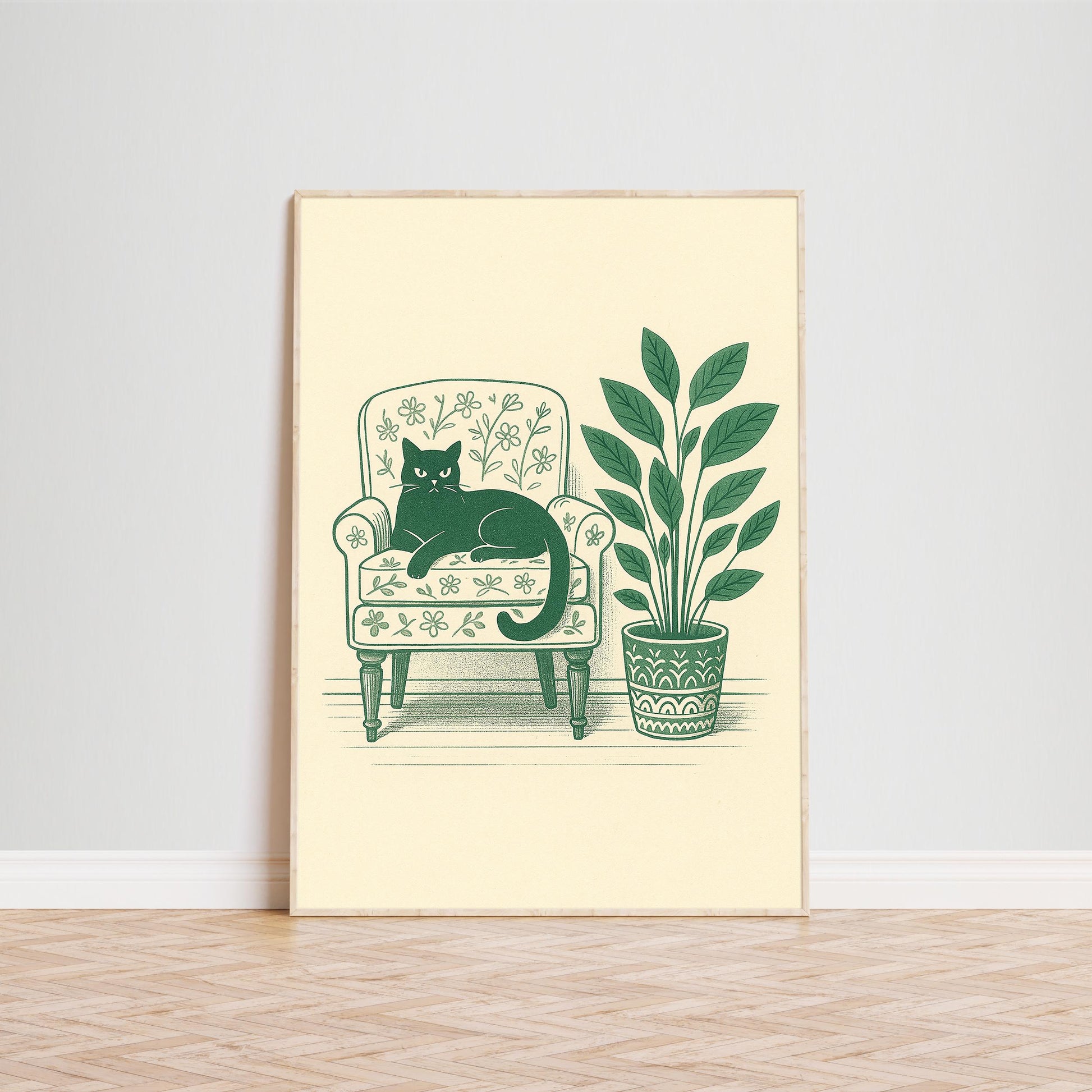 Lazy Afternoon Cat – Minimal Line Art Poster, Vintage Floral Chair Illustration