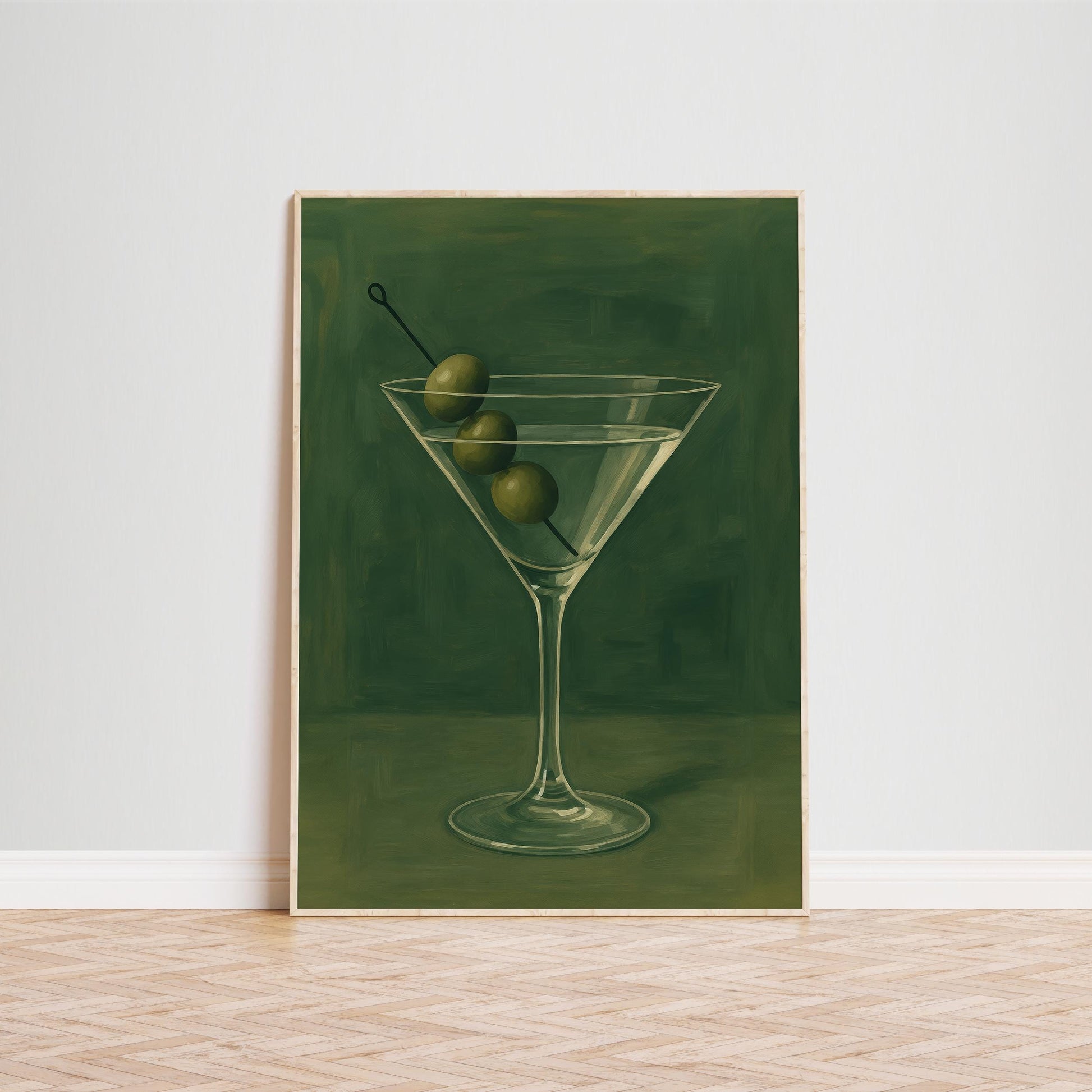 Martini Glass Poster – Minimalist Olive Green Cocktail Wall Art for Elegant Bar Decor