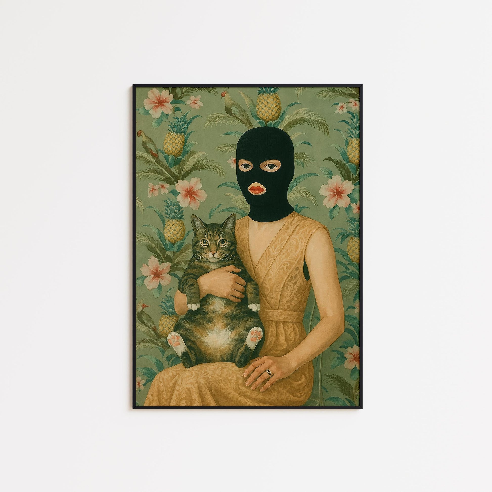 Masked Woman Poster – Surreal Wall Art With Cat, Vintage Gouache Print