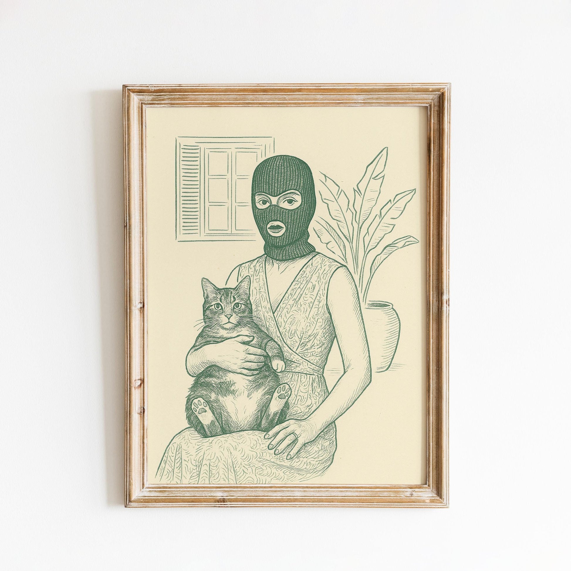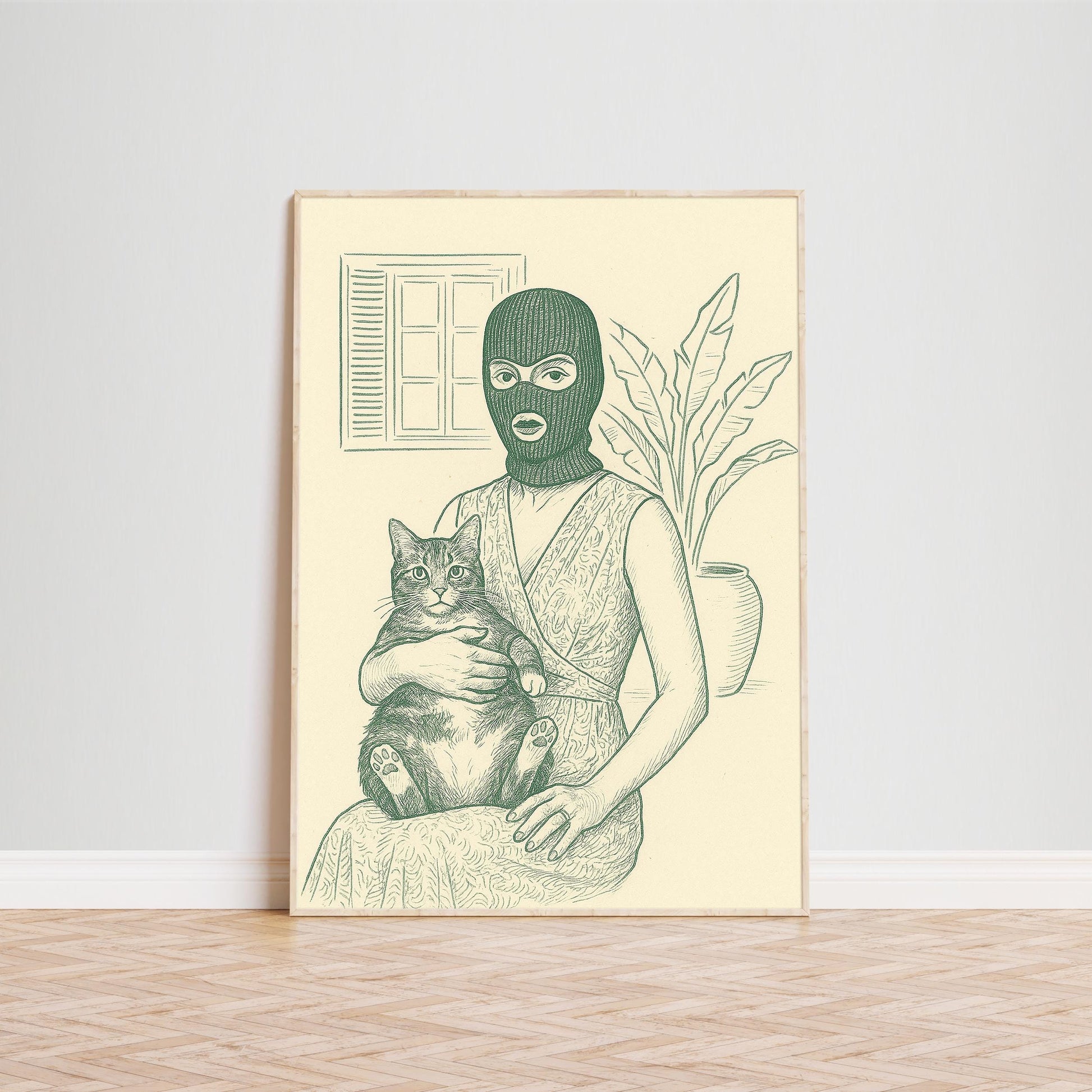 Masked Woman with Cat Poster – Surreal Line Art Print, Femmaura Bold Series