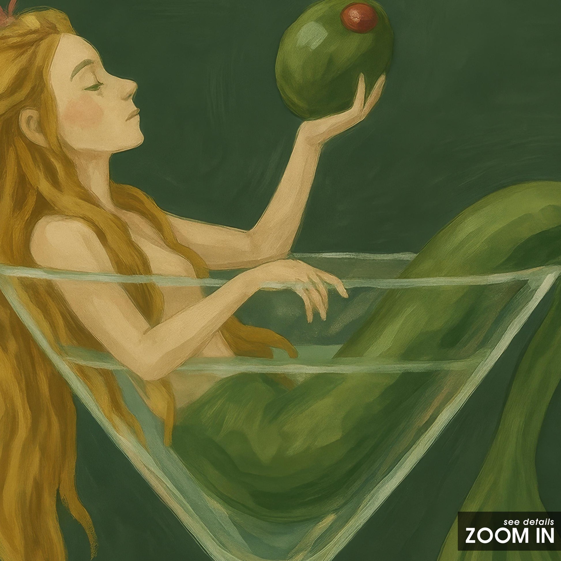 Mermaid Wall Art - Fantasy Cocktail Print in Green Martini Glass for Bar Decor
