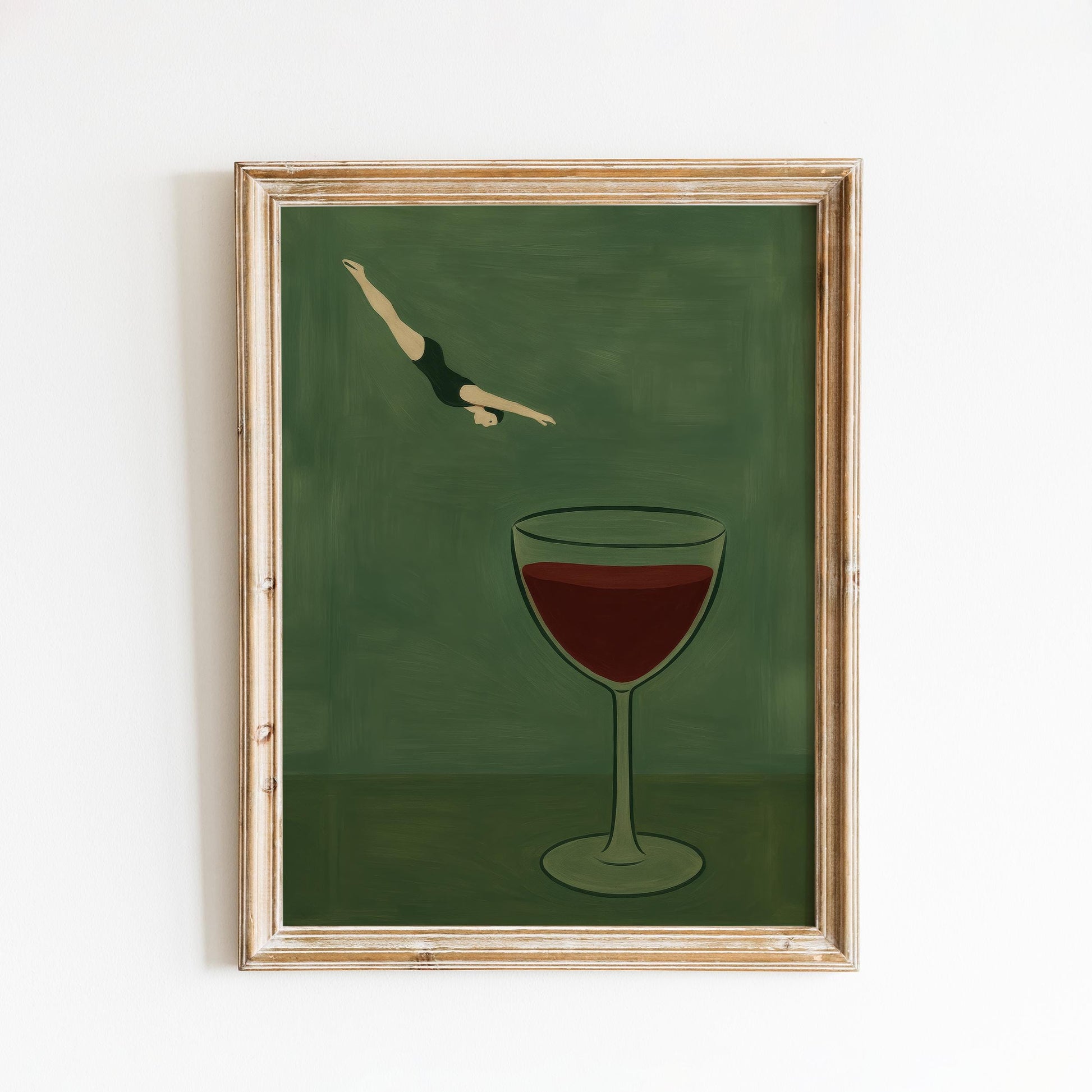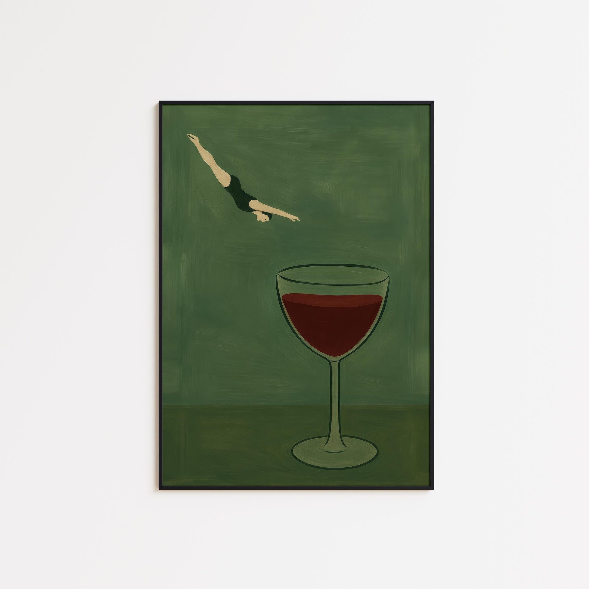Minimalist Surrealist Poster – Diving Wine Artwork with Green Background & Poetic Charm