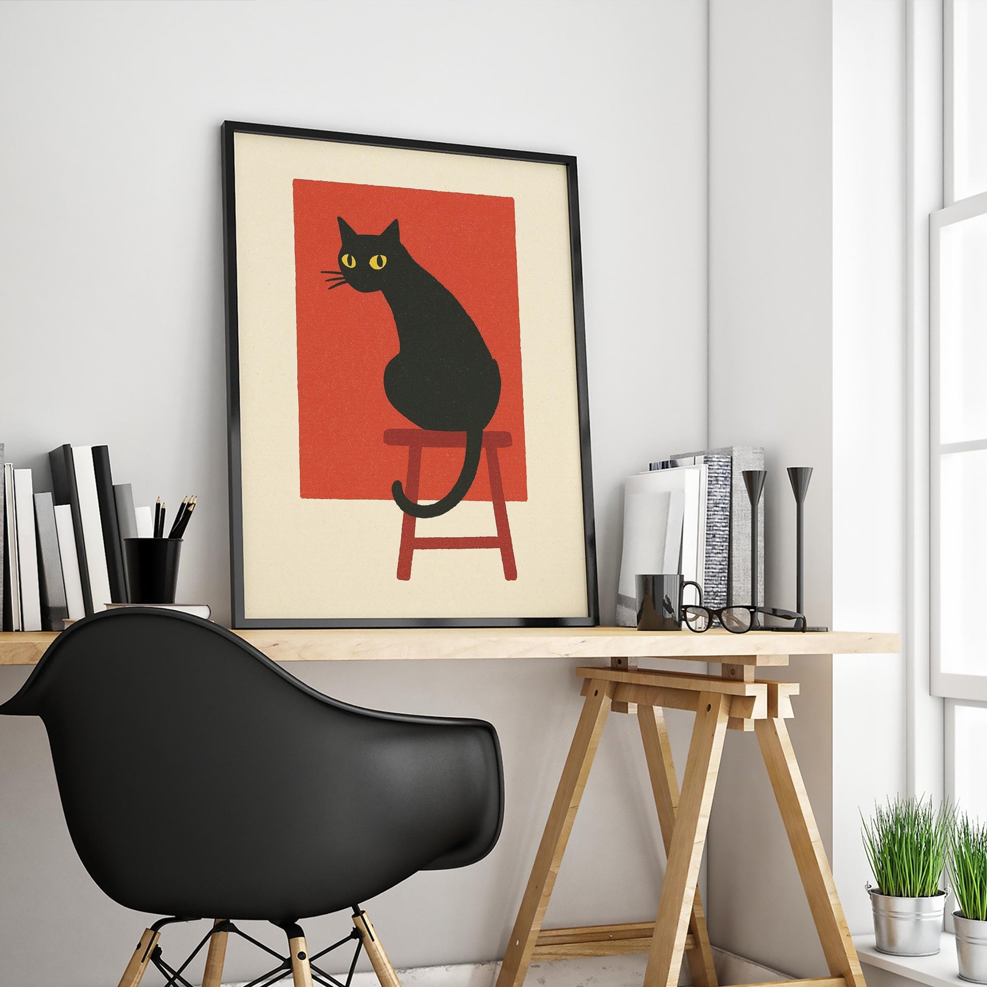 Modern Black Cat Poster – Bold Minimal Art Print, Red Abstract Wall Decor