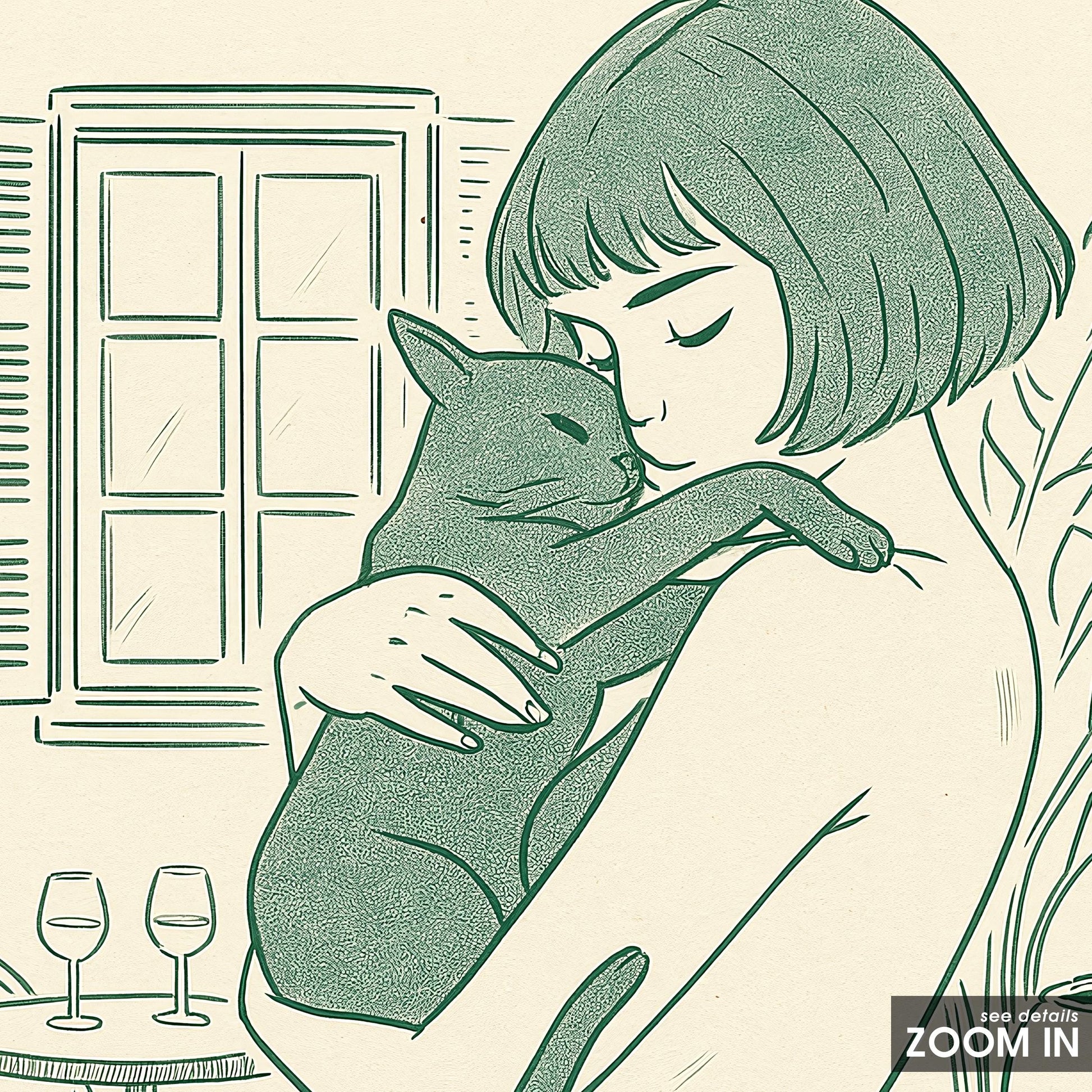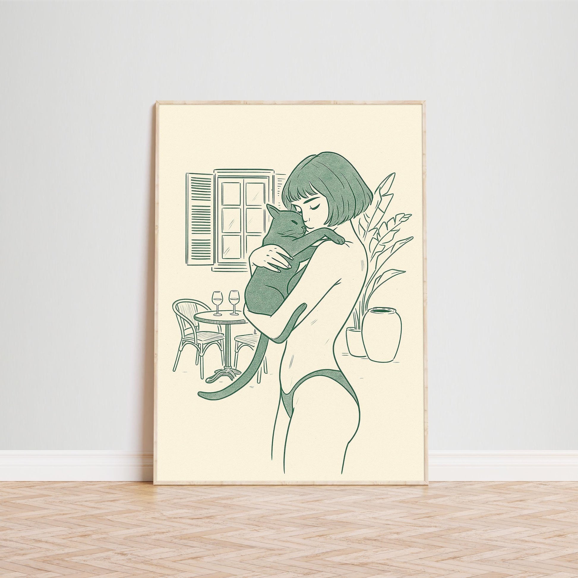 Morning Balcony – Woman and Cat Line Art, Intimate Minimal Illustration Print