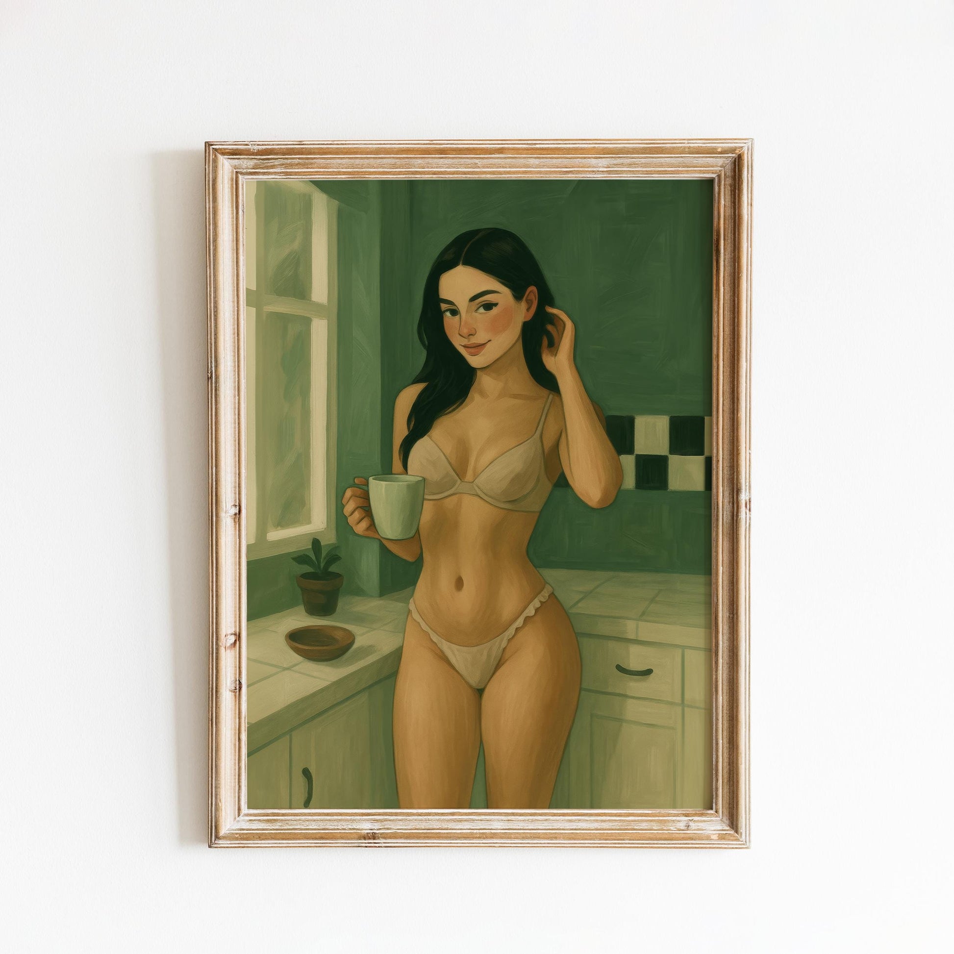 Morning Coffee Girl Poster – Feminine Wall Art | Boudoir Style Print in Soft Green Tones