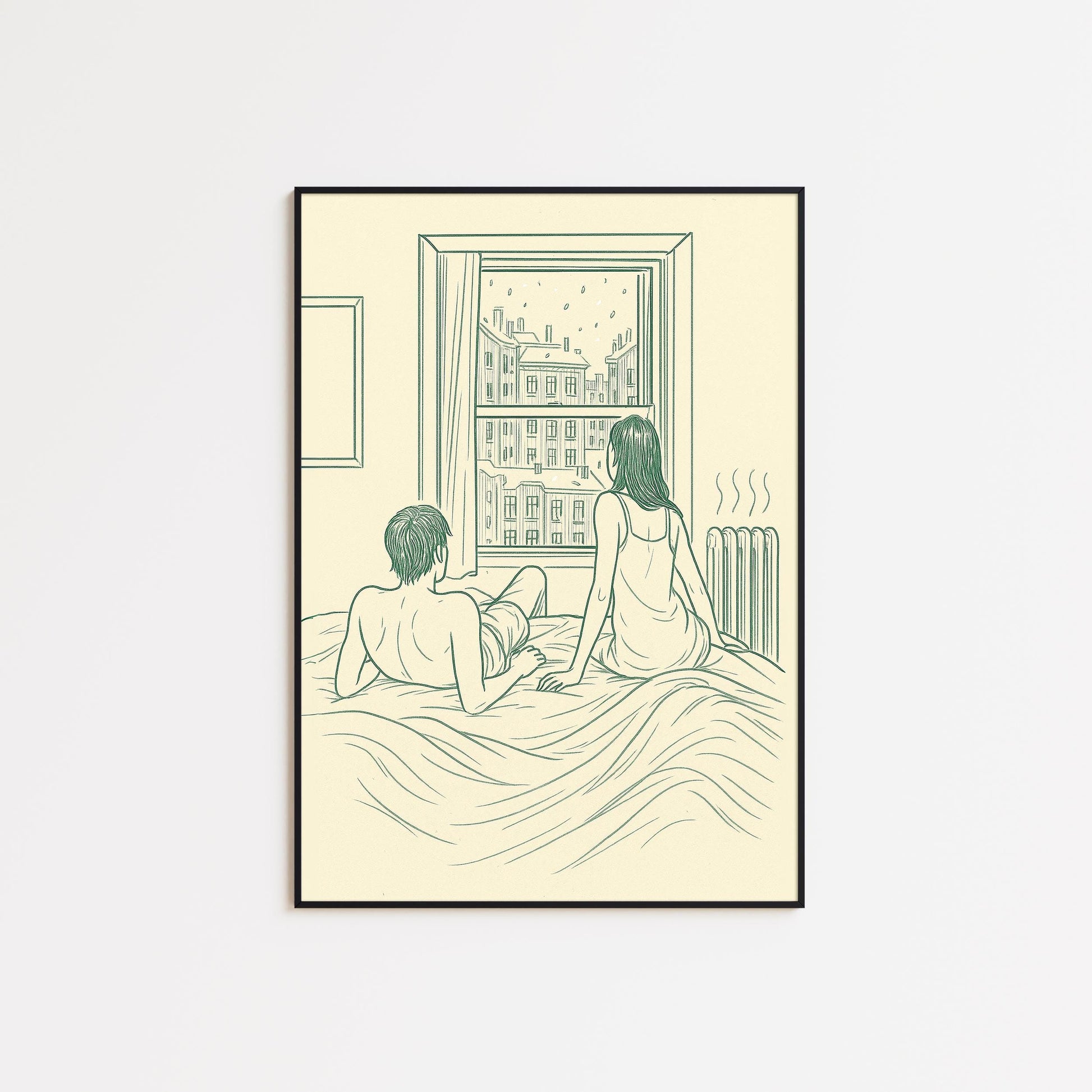 Morning in Paris – Minimal Line Art Couple Poster, Cozy Bedroom Wall Art Print