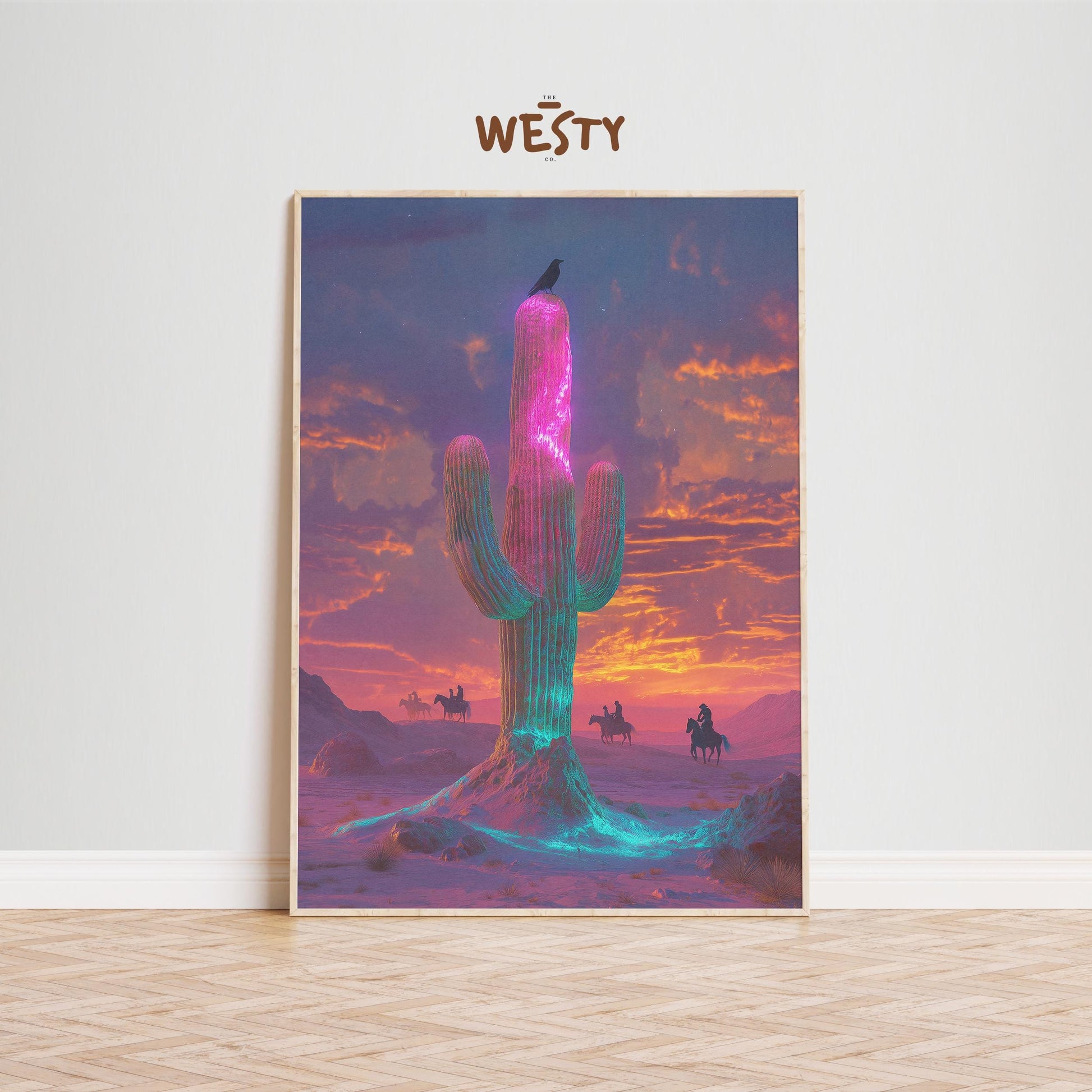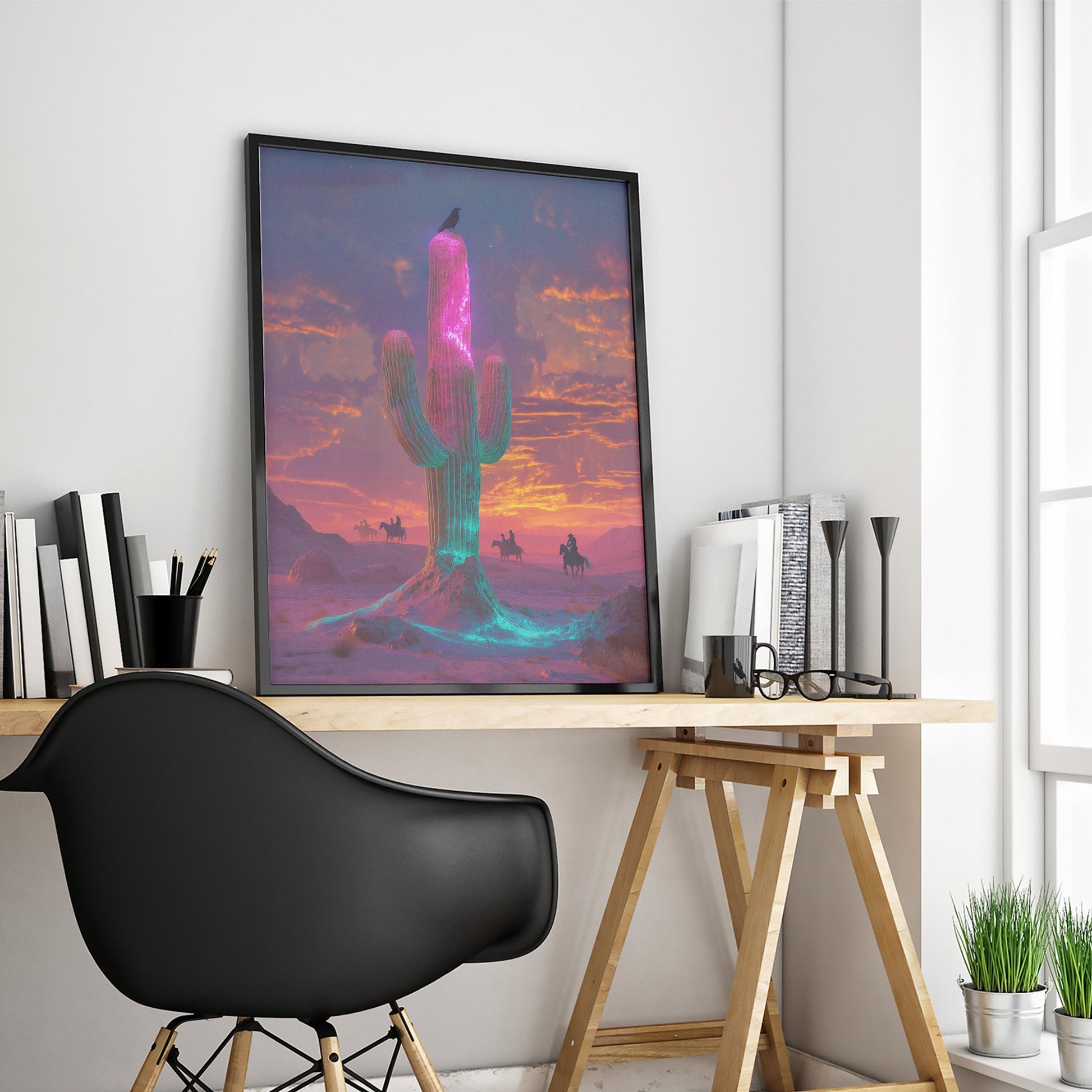 Neon Cactus Sunset – Surreal Desert Cowboy Poster