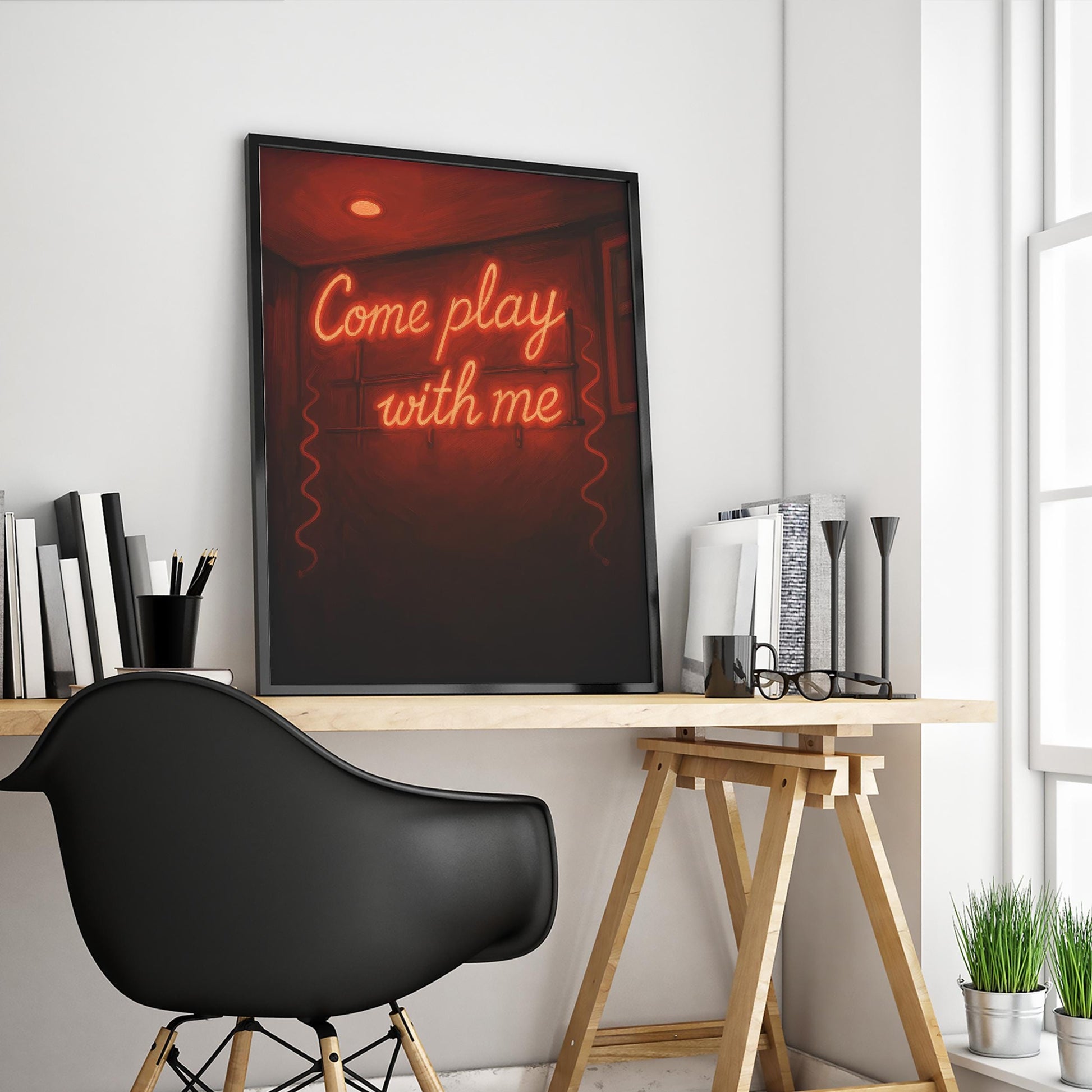 Neon Red Wall Art – Provocative Come Play Sign Poster for Bedroom & Bar Decor