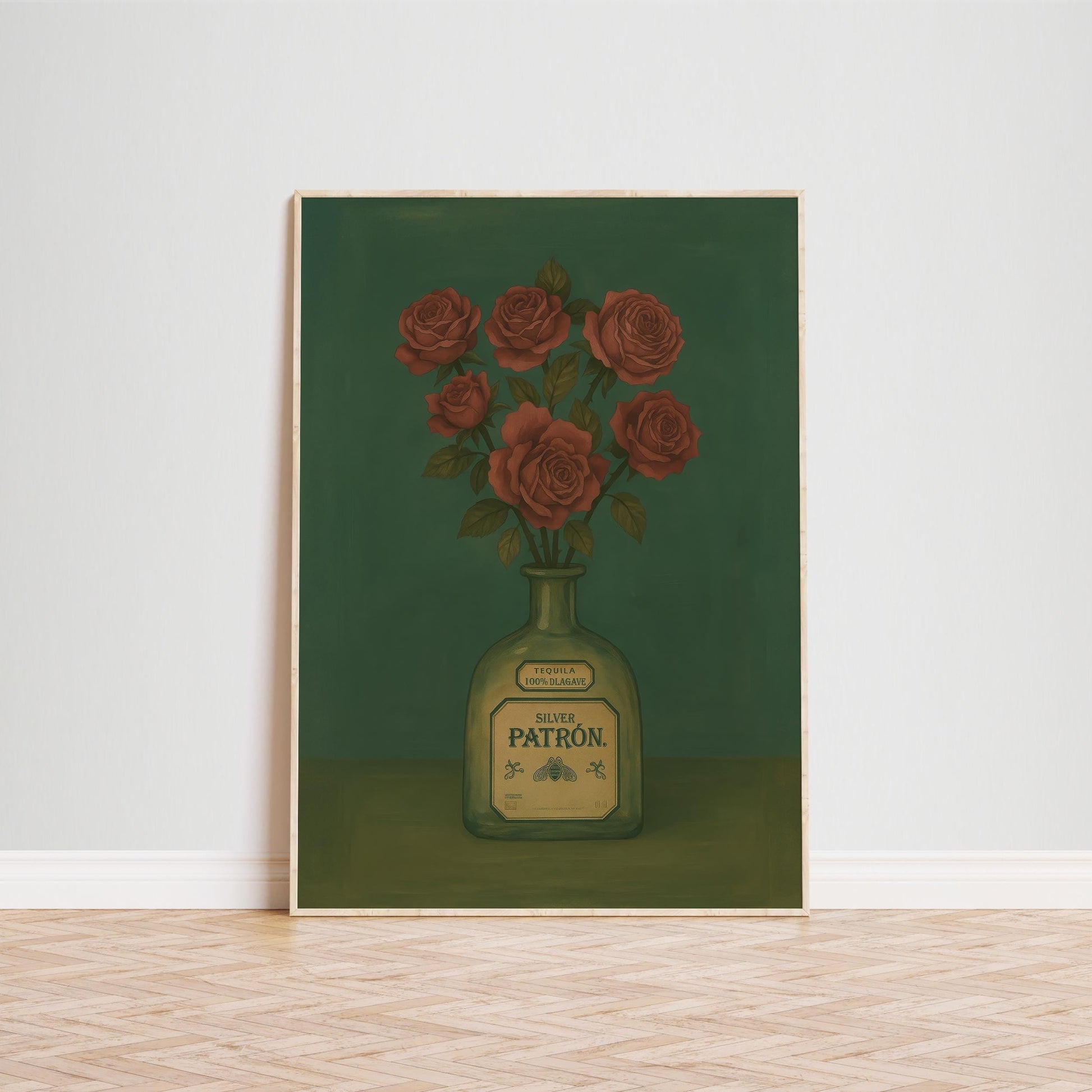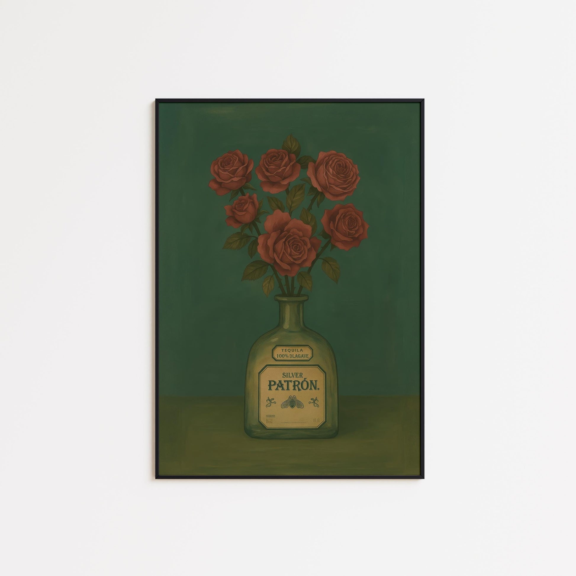 Patron Tequila Wall Art – Vintage Still Life with Red Roses & Rustic Charm Print