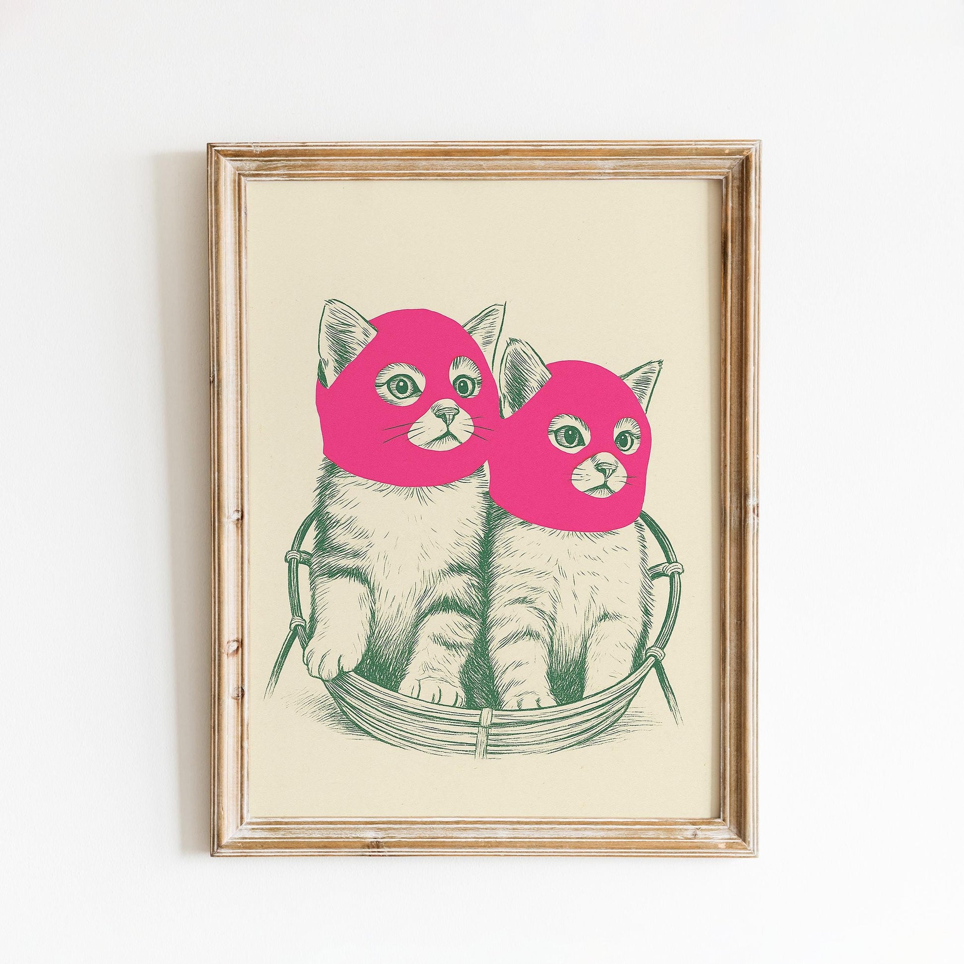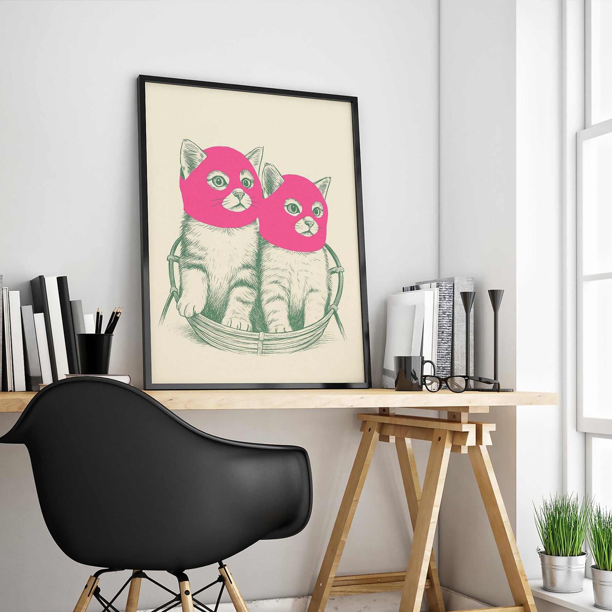 Pink Mask Cats Poster – Funny Pop Art Animal Print, Modern Minimal Wall Decor