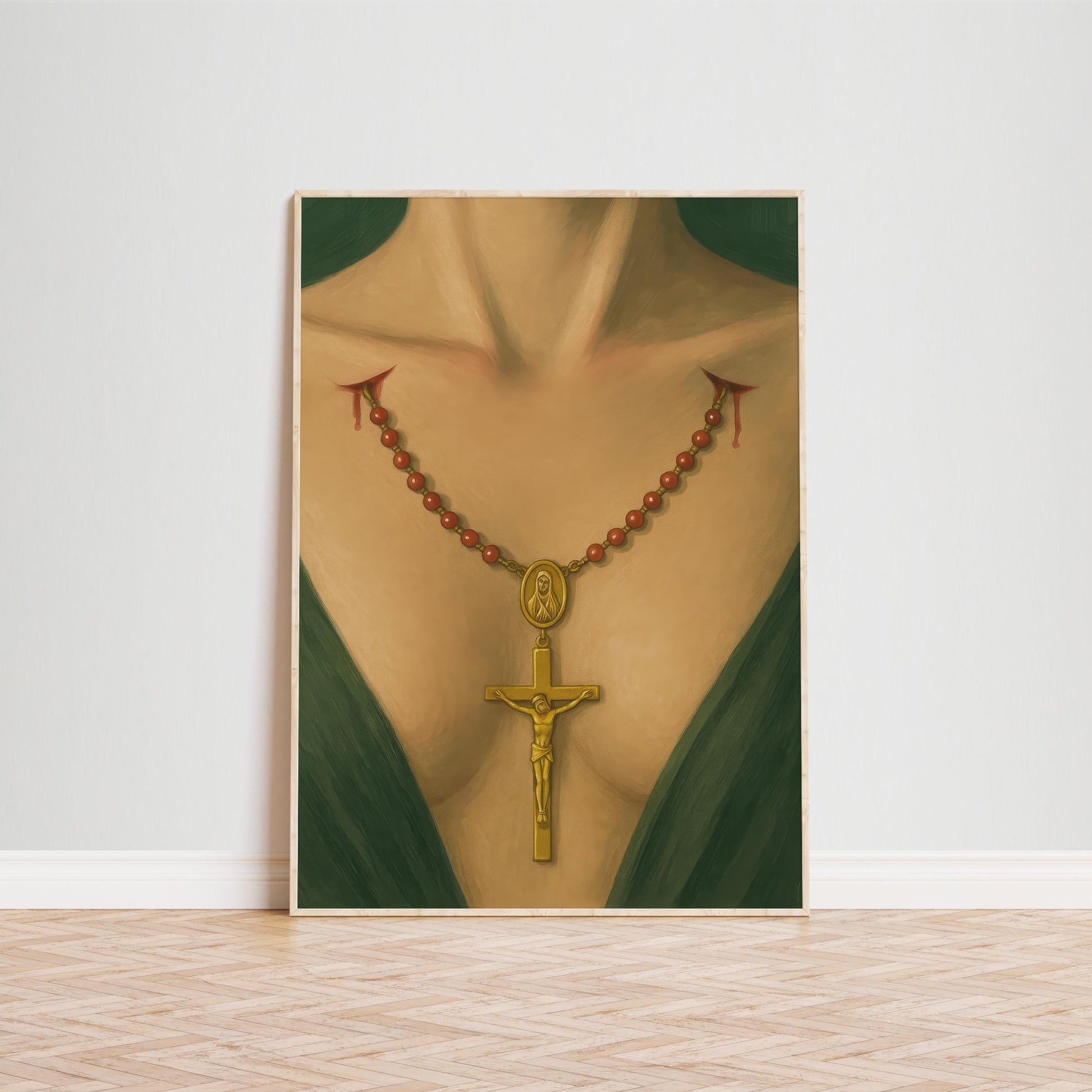 Provocative Religious Art – Rosary Art Print with Gold Crucifix and Sensual Gothic Imagery