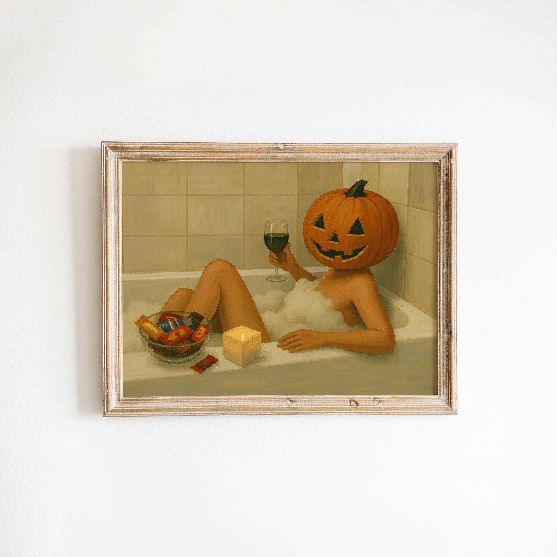 Pumpkin Head Bath Poster – Cozy Halloween Wall Art | Festive Autumn Decor