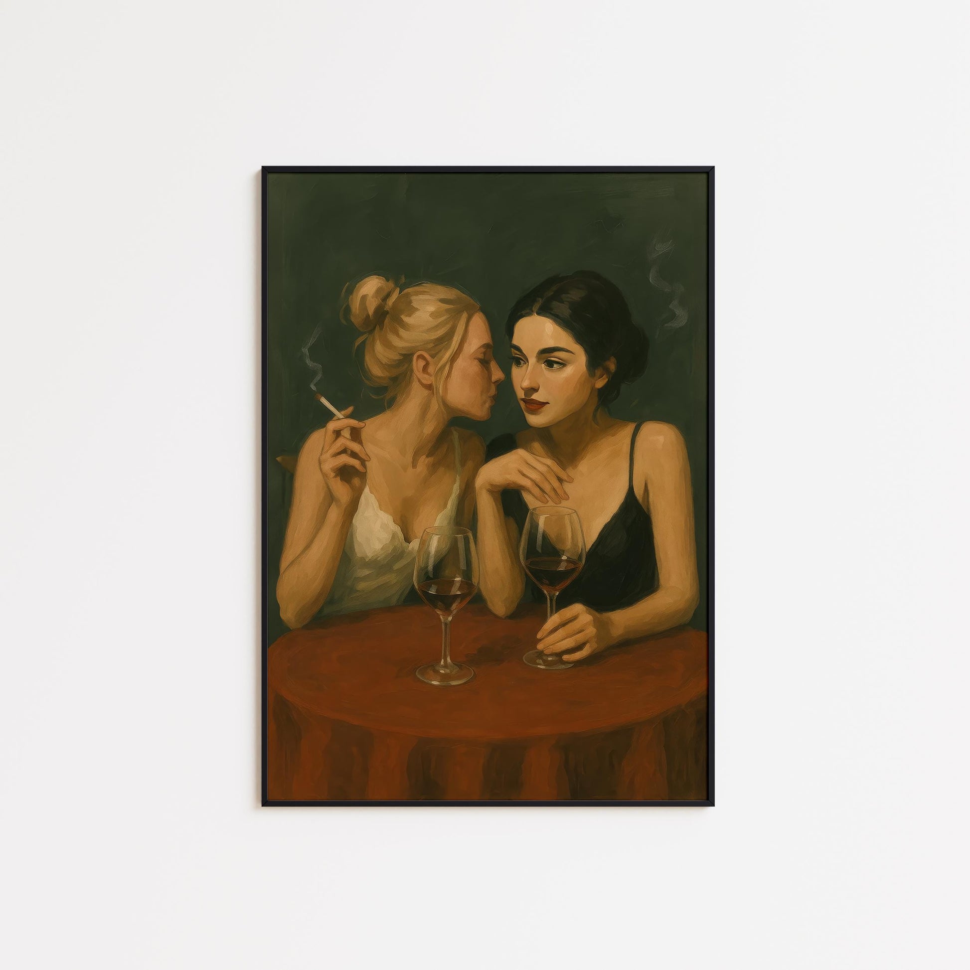 Romantic Bar Art Print – Intimate Lesbian Couple Sapphic Romance Wall Decor