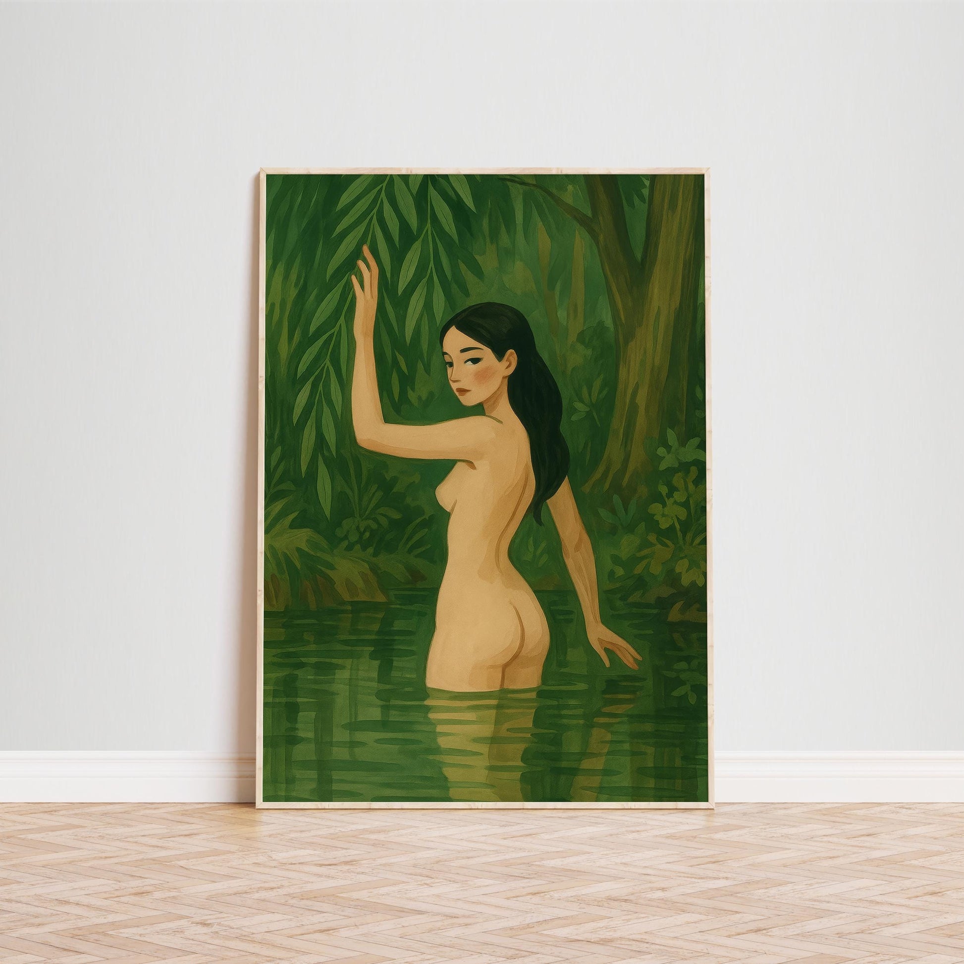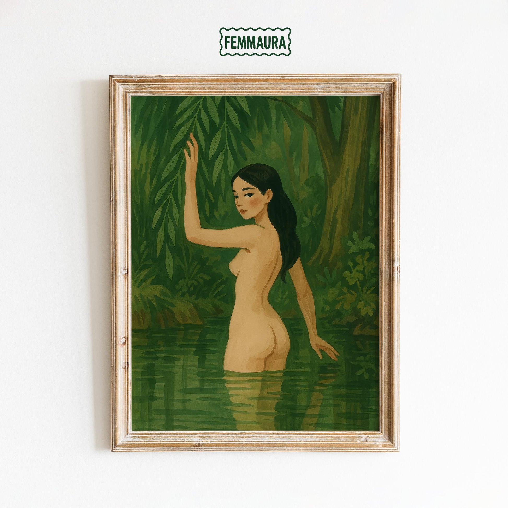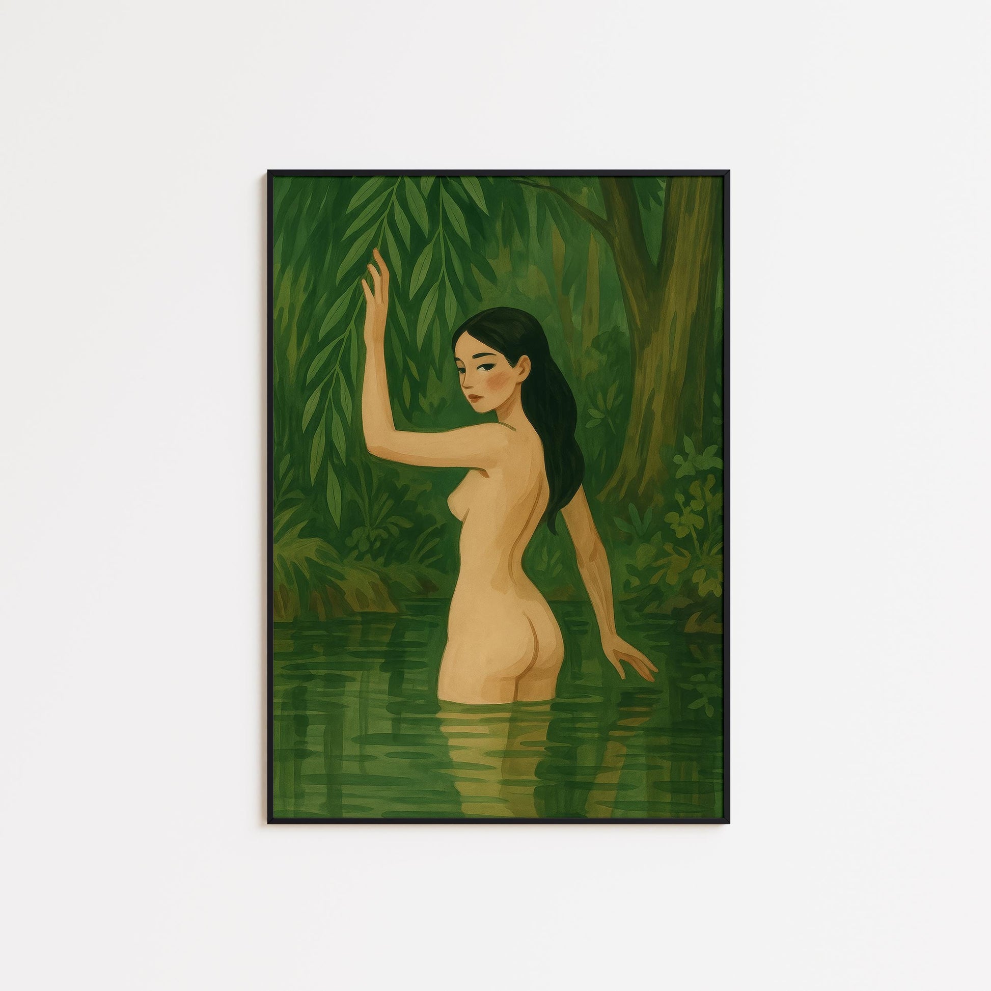 Sensual Feminine Wall Art – Nude Art Print With Forest Water & Green Aesthetic