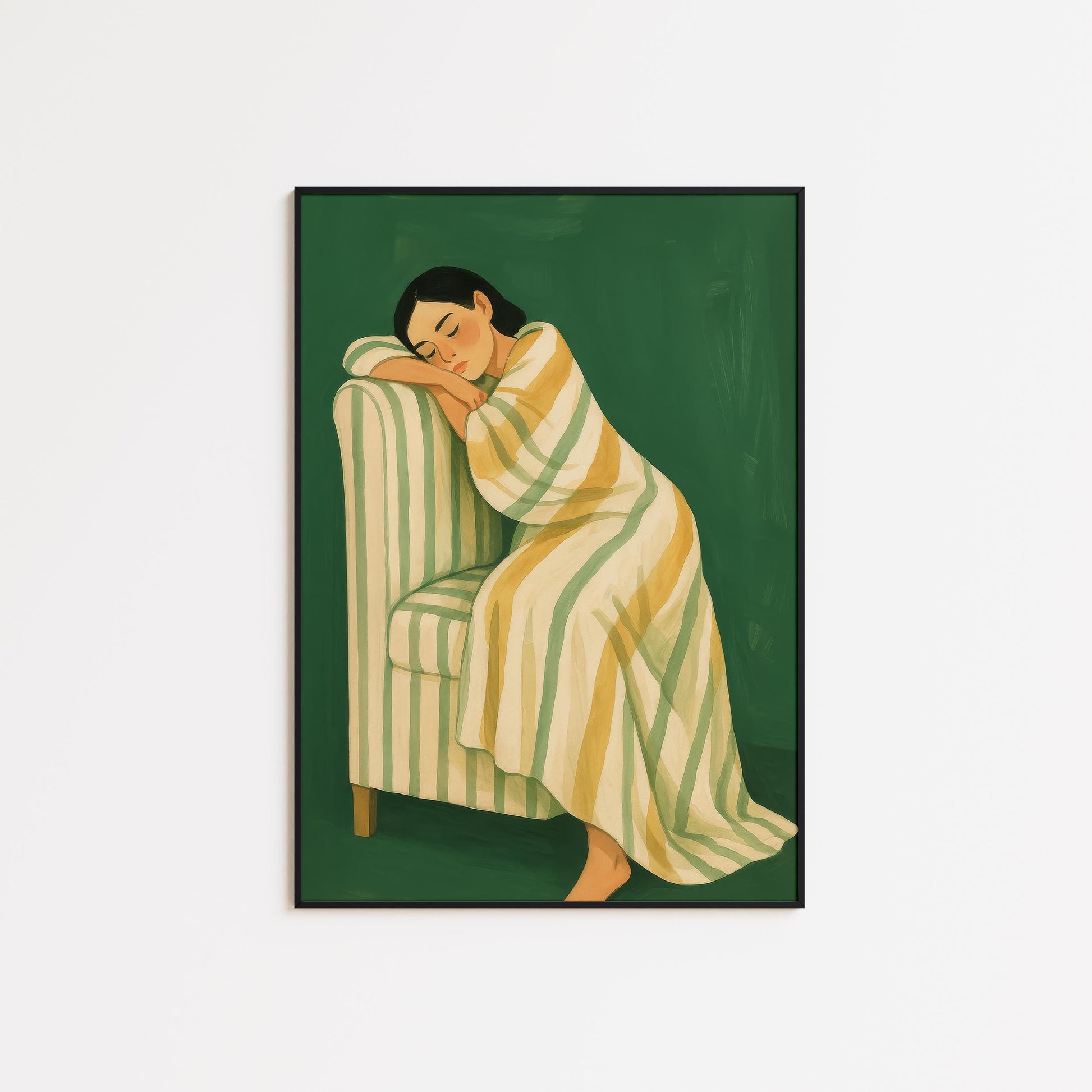 Striped Chair Girl Poster – Calm Resting Art | Green Yellow Decor & Cozy Wall Print