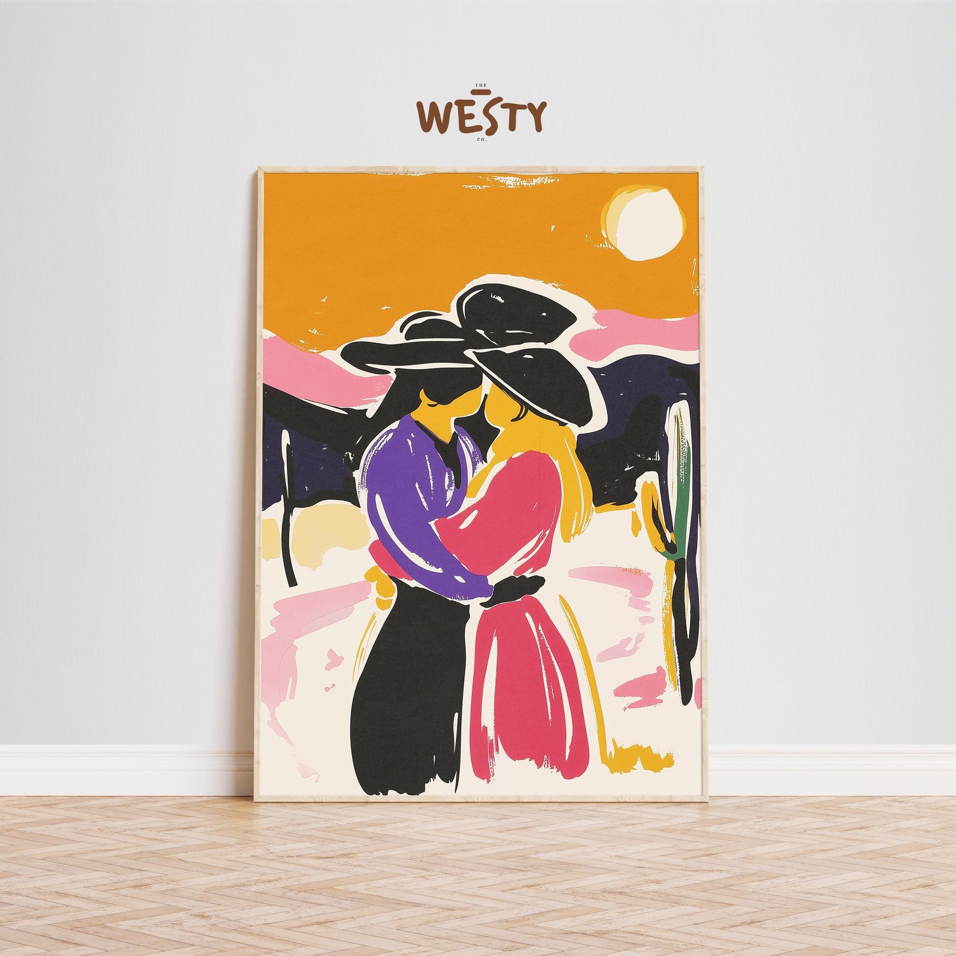 Sunset Cowgirls Kiss – Colorful Western Love Poster
