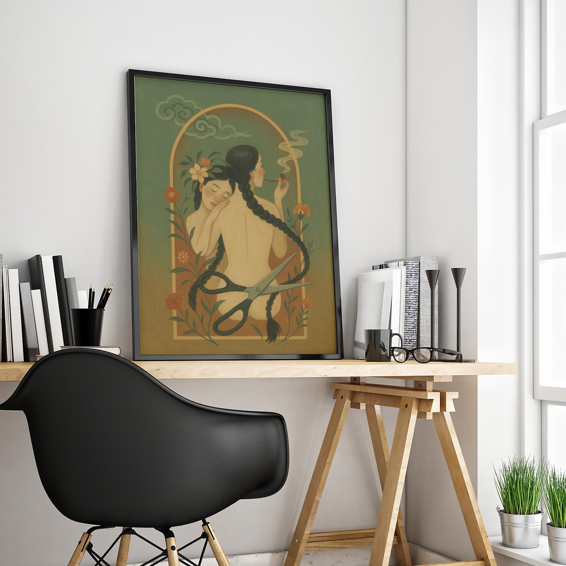 Surreal Feminine Breakup Art – Symbolic Lesbian Couple Poster With Floral Scene