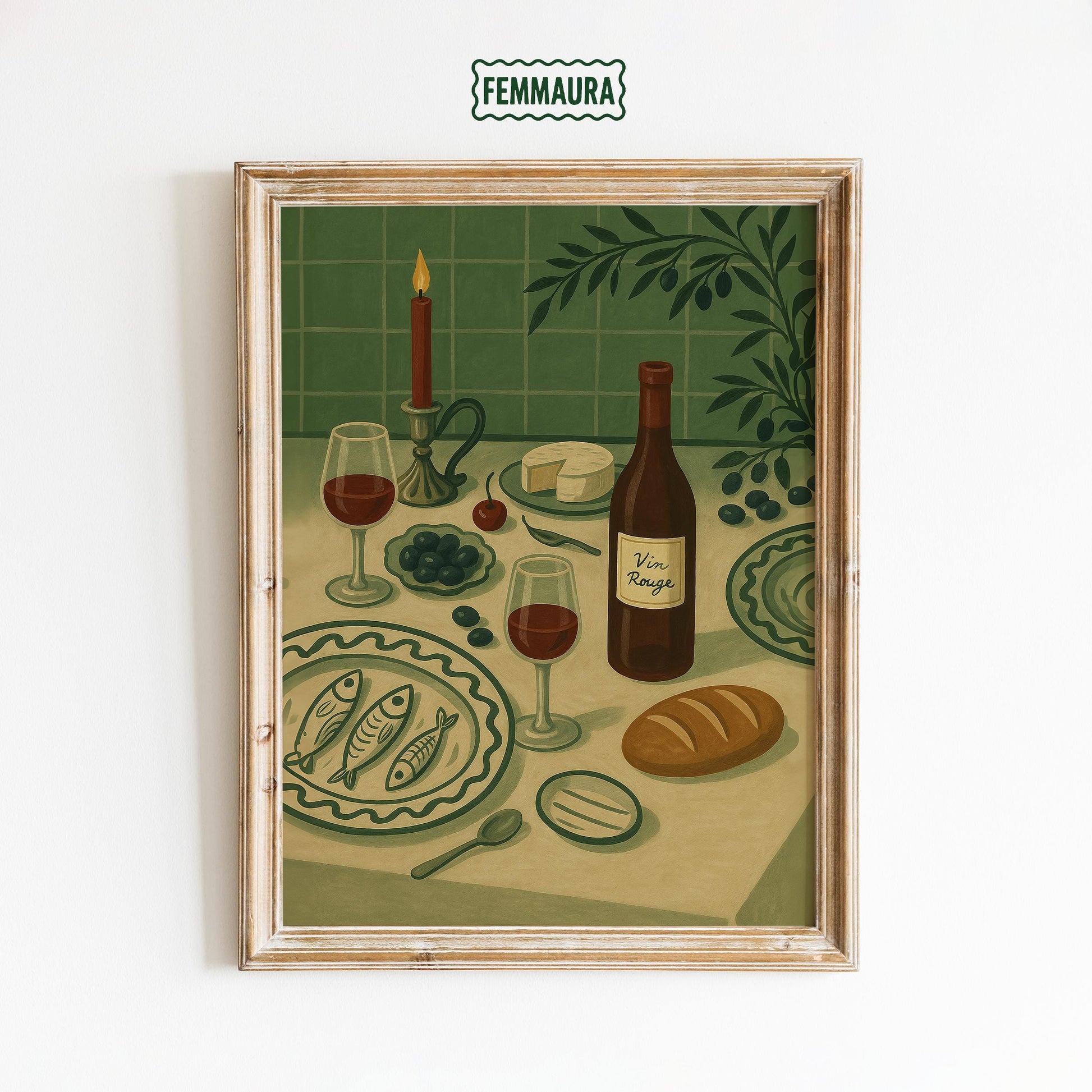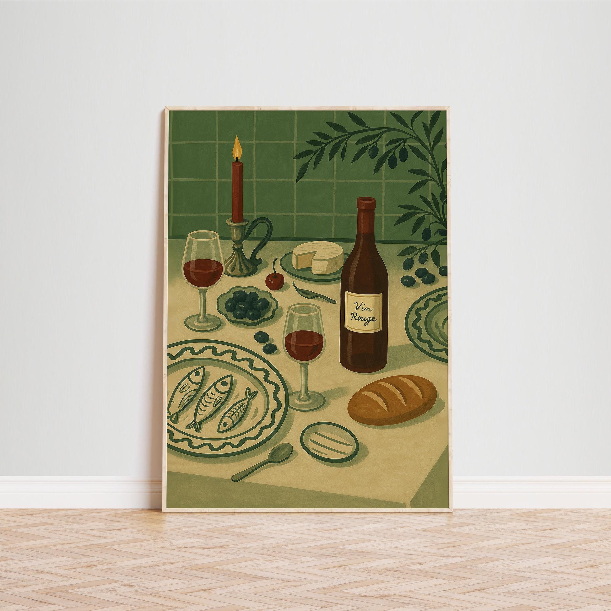 Vin Rouge Poster – French Kitchen Art With Retro Dining Scene & Olive Green Decor