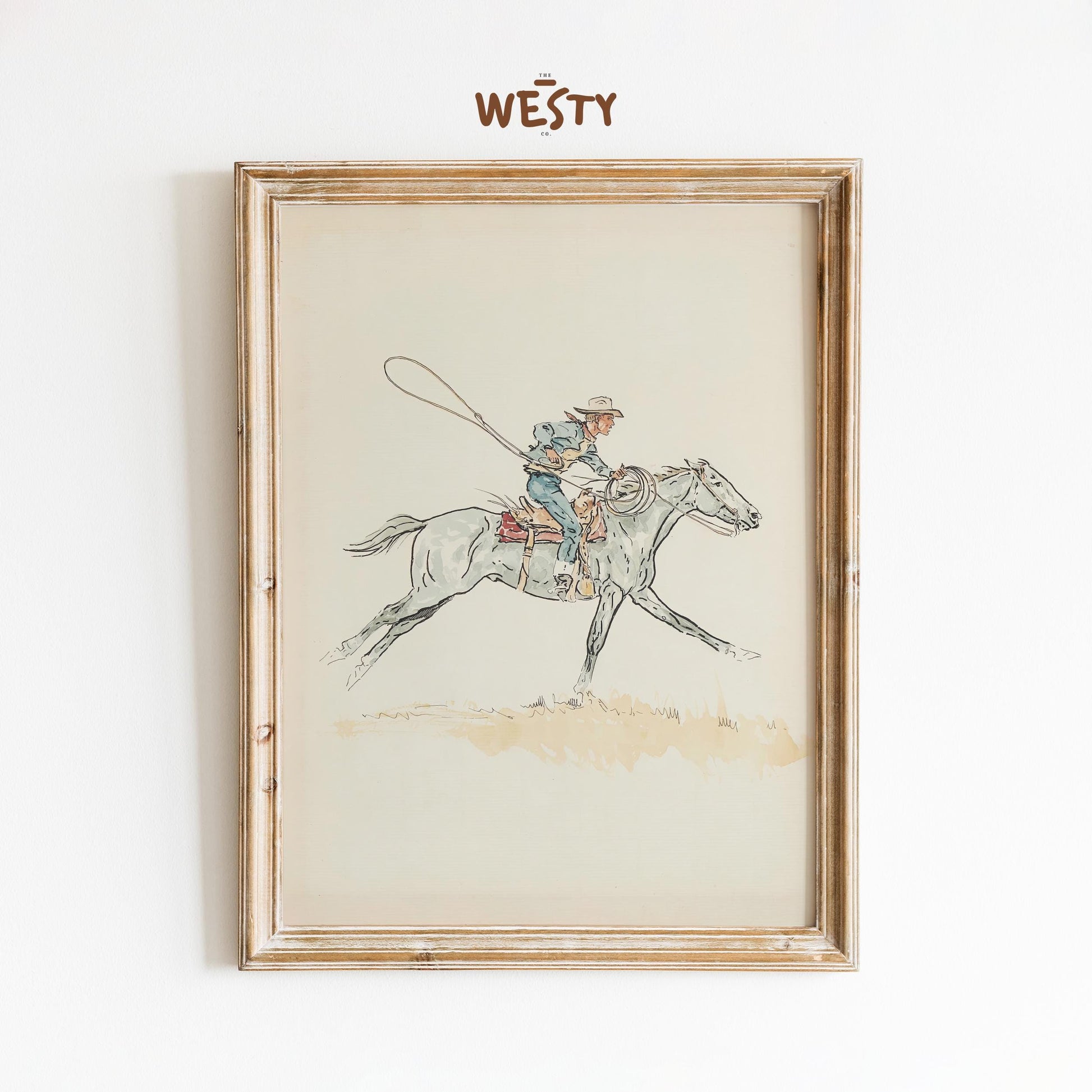 Vintage Cowboy Roping Art – Western Horse Illustration Print