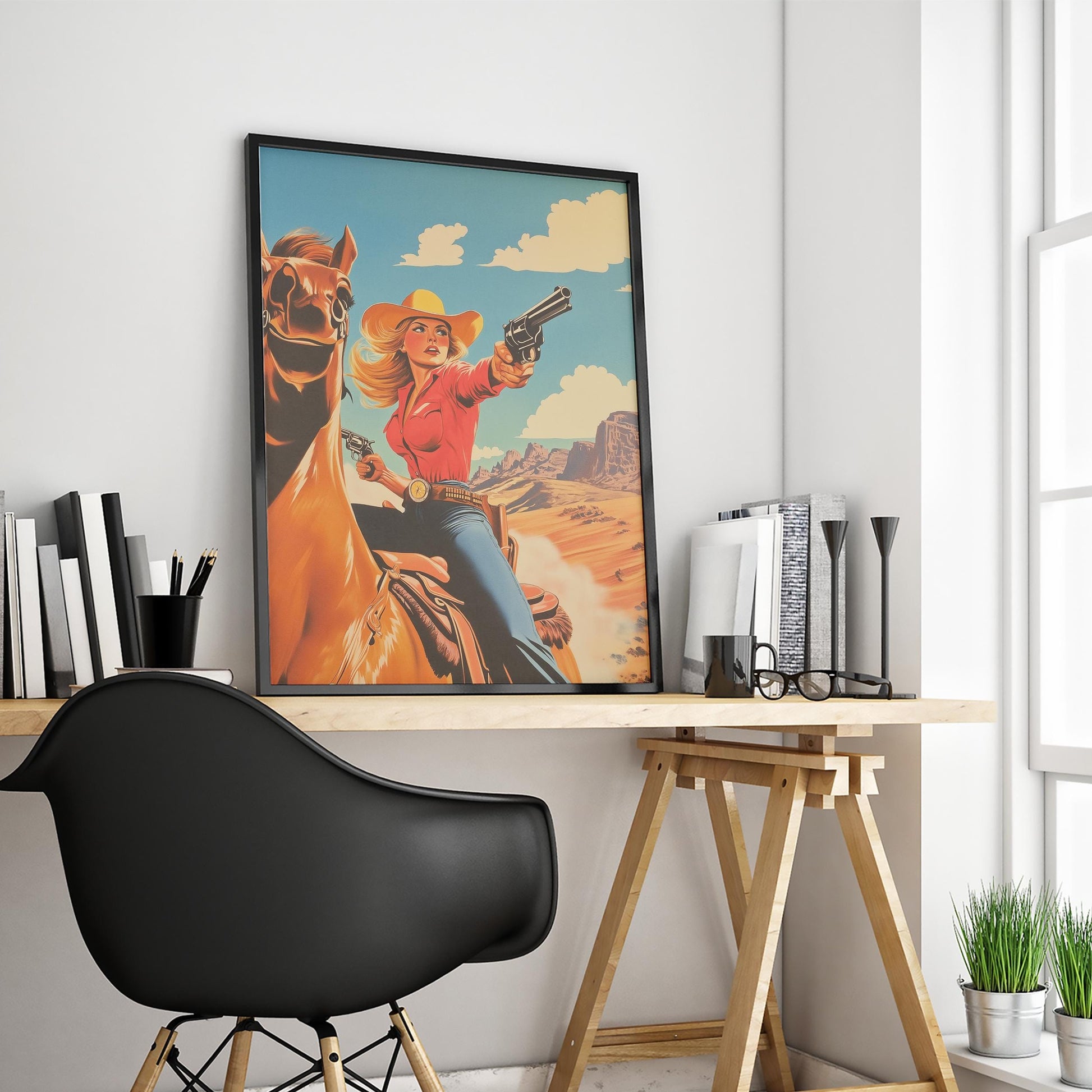 Vintage Cowgirl Poster – Bold Retro Western Woman with Guns